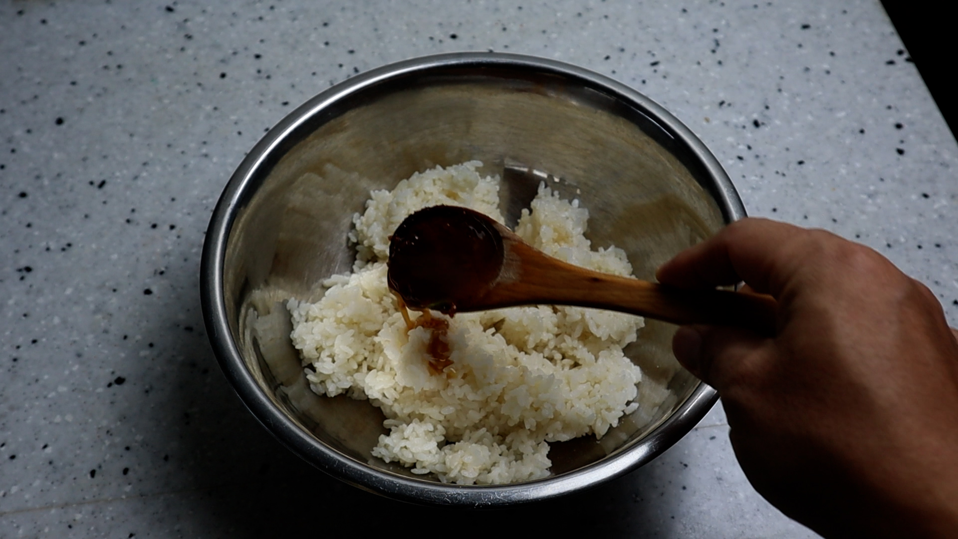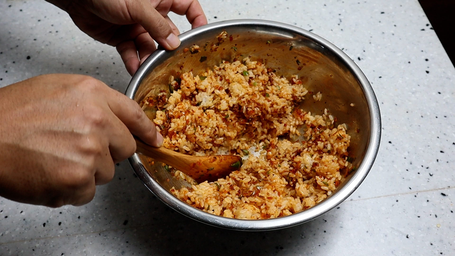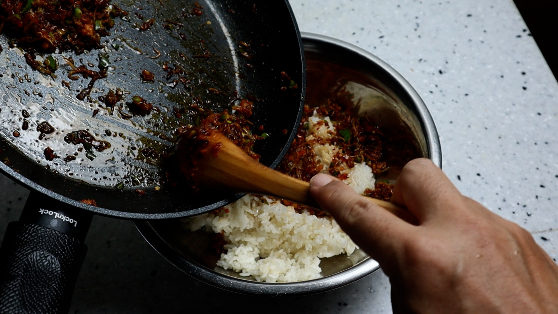 17. 밥 2공기에 멸치볶음을 70~80% 정도 부어주세요. 간을 좀 쎄게 드시면 전부 넣으셔도 됩니다.
