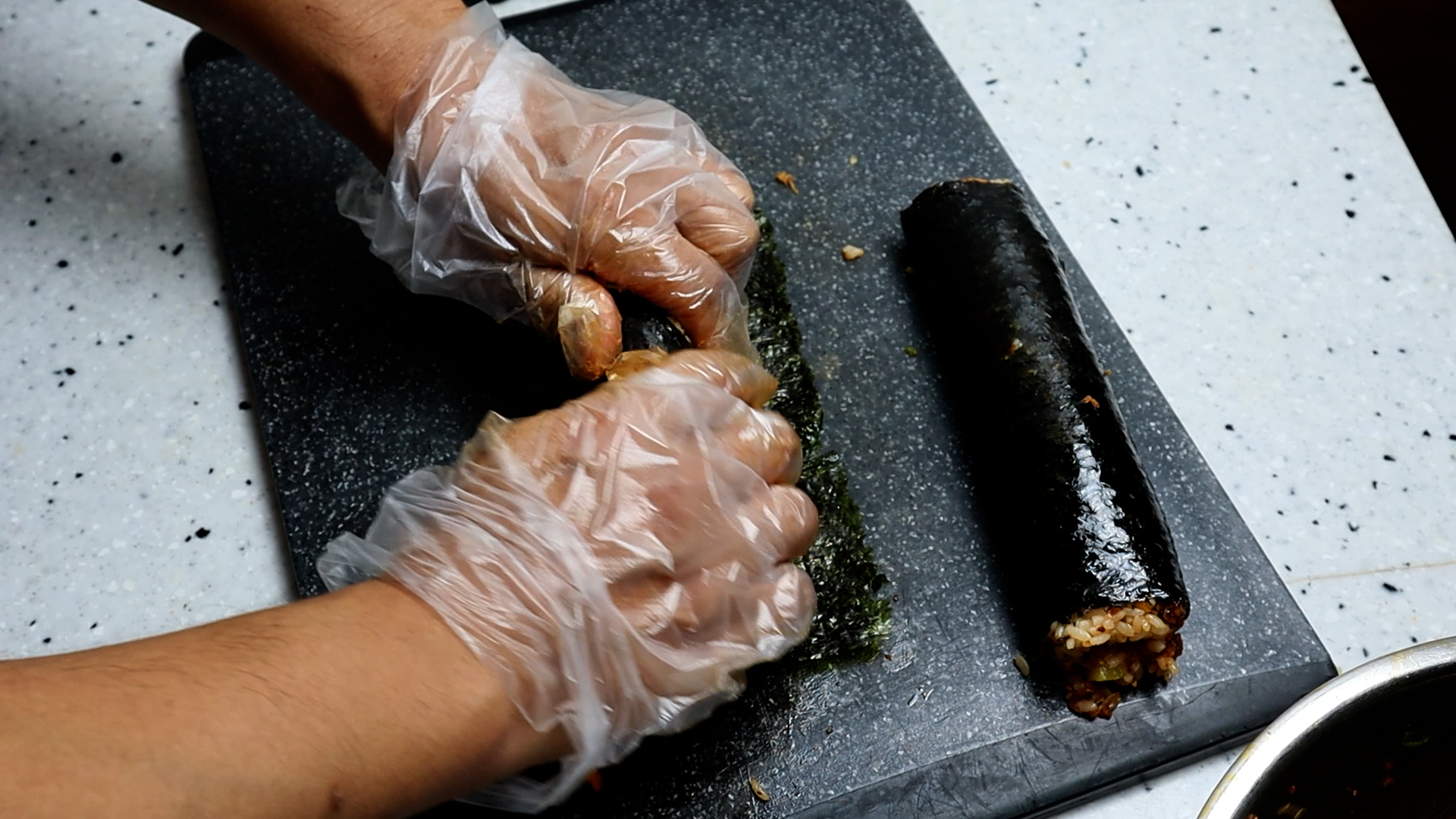 22. 1~2줄 마는데 참기름 솔 쓰면 설거지 귀찮으니 비닐 장갑에 참기름을 적당히 발라서 말아놓은 김밥 표면에 참기름을 발라주세요.