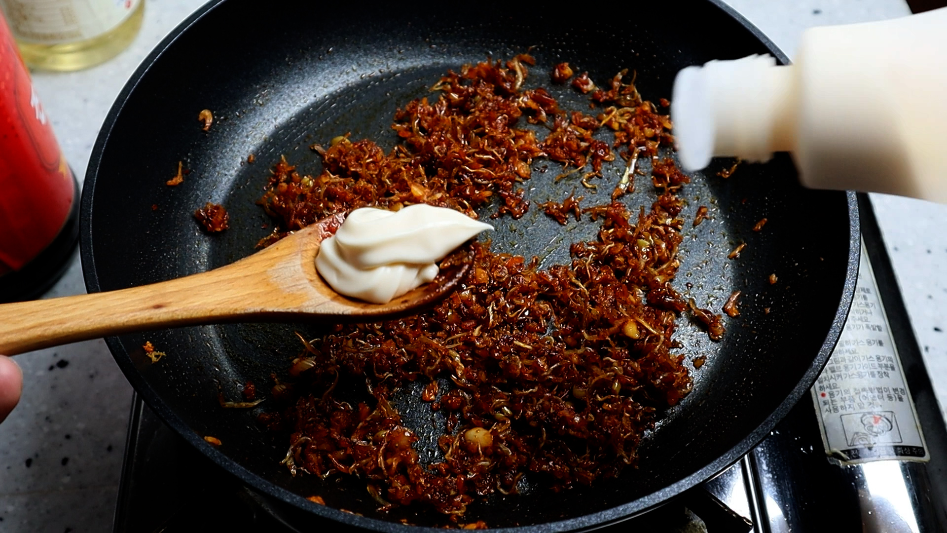 12. 물엿을 녹이며 섞은 다음에 불 그대로 끈 상태로 마요네즈 1스푼을 넣고 골고루 섞어주세요.