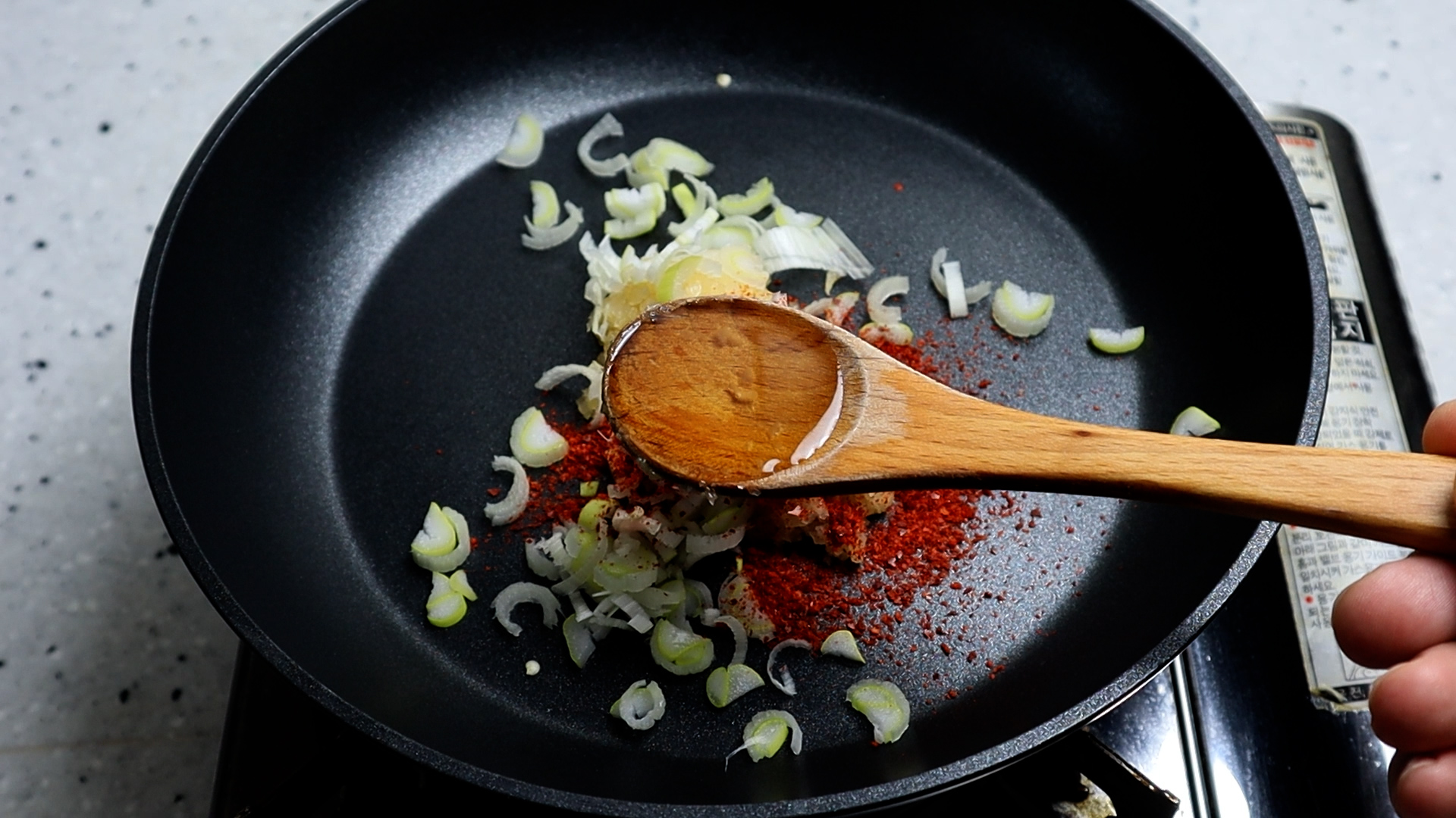 5. 썰어놓은 대파와 고춧가루를 넣고 식용유도 넣어주세요. 고춧가루는 너무 굵거나 가는거 말고 중간입자 고춧가루를 사용해주세요.
