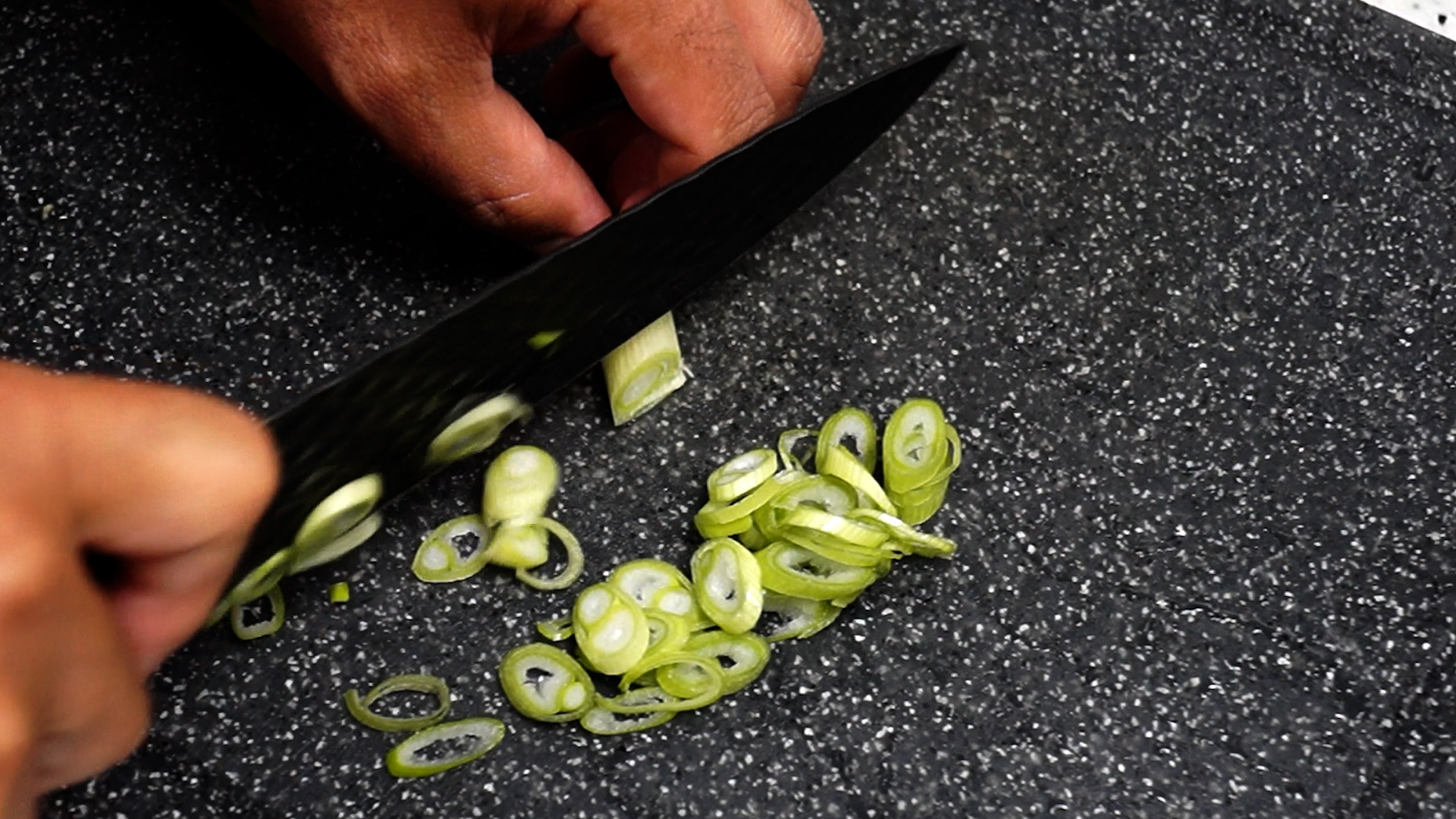 1. 대파 4큰술 정도 되는 분량을 얇게 어슷 썰어주세요.
