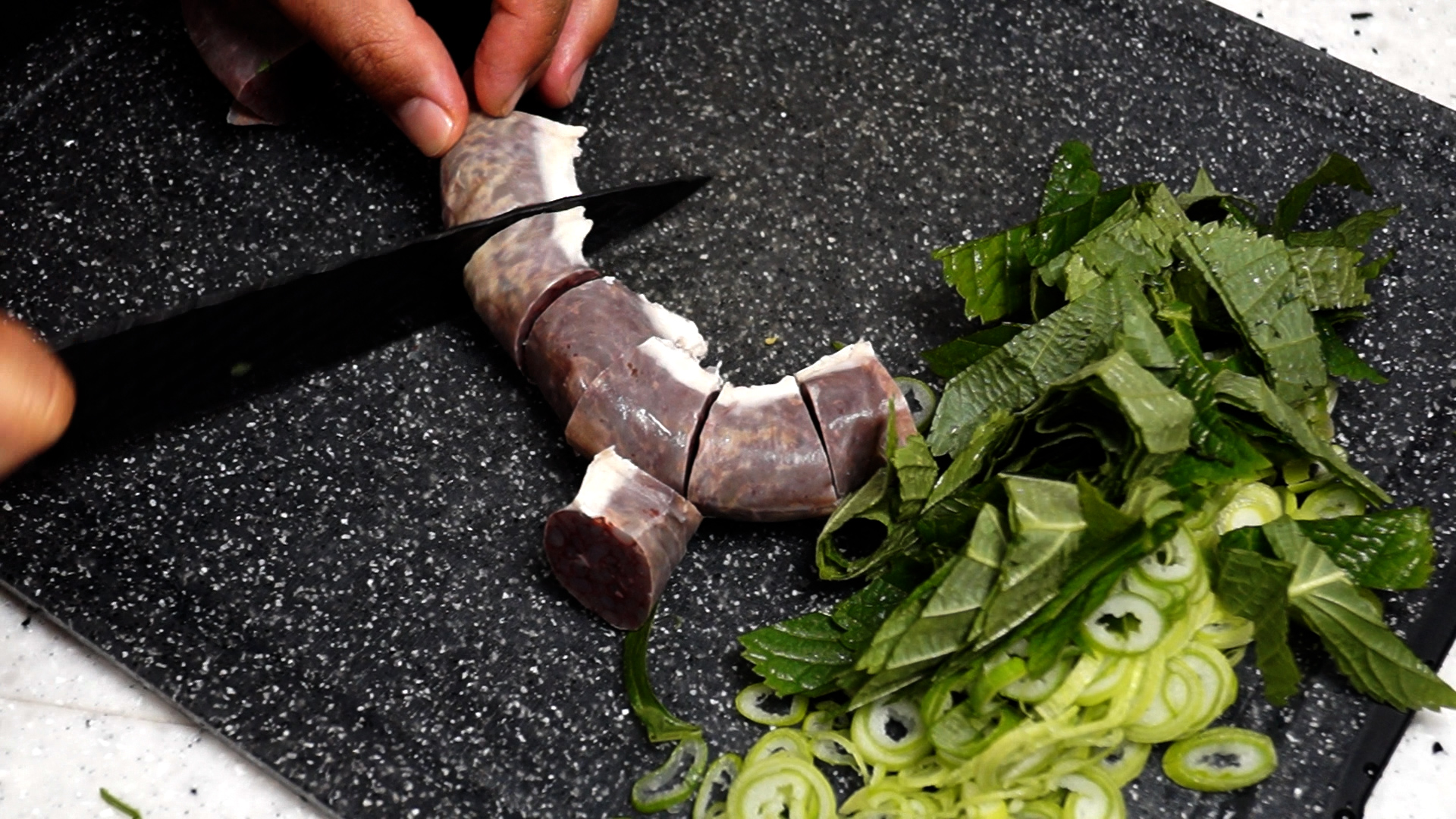 2. 깻잎은 1~2cm 크기로 잘라주세요. 돼지국밥엔 부추가 잘 어울린다면 얼큰한 순대국밥엔 깻잎 향이 엄청 잘 어울립니다.