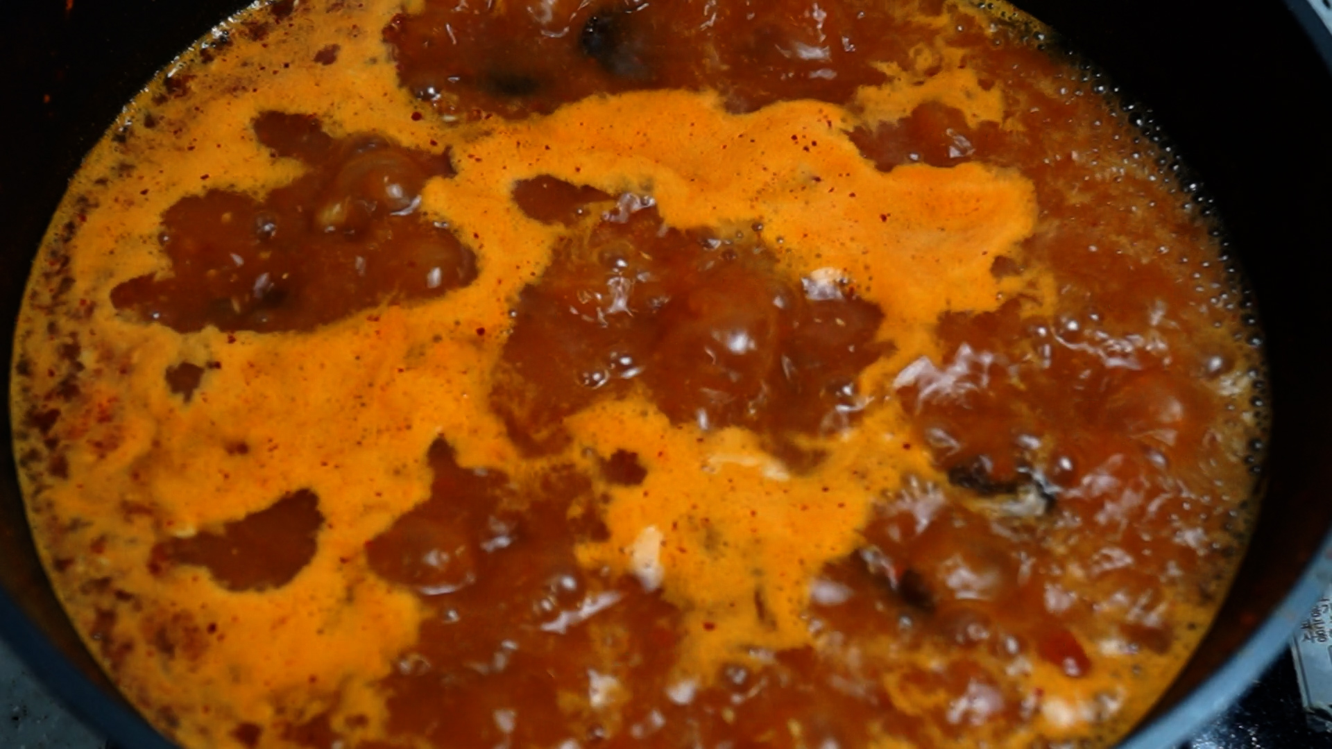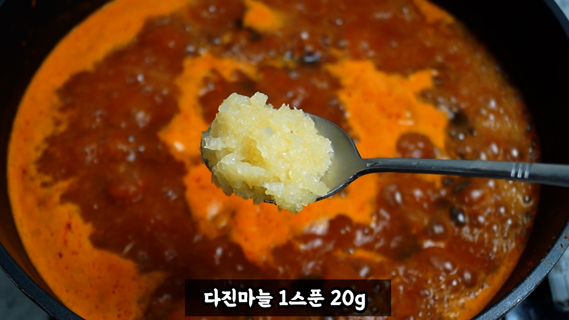 12. 1분을 끓인 다음에 다진 마늘을 1스푼 넣어주세요. 마늘을 넣어주면 알싸한 매운맛을 냄과 동시에 잡내를 한번더 잡아주고 국물이 깊고 진해집니다.