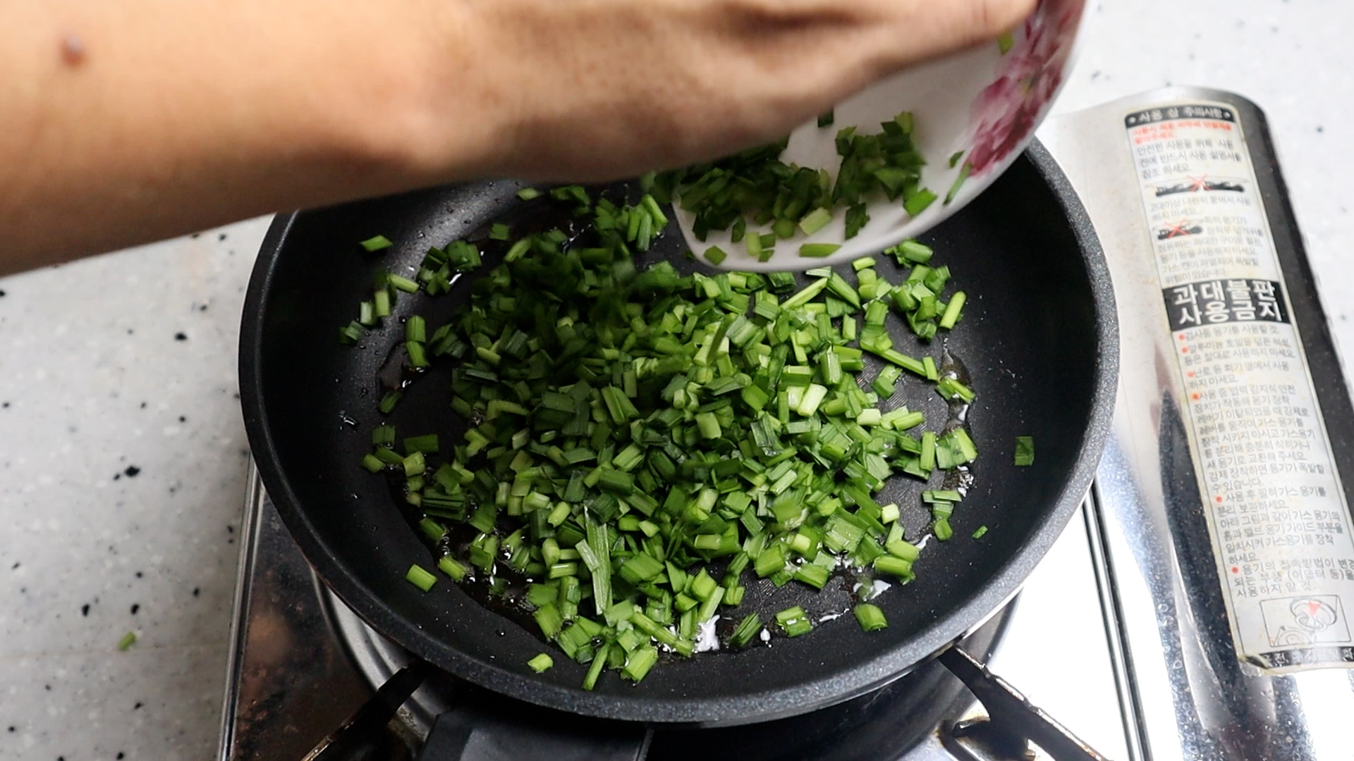11. 약불로 달군 계란후라이용 코팅팬에 식용유와 참기름을 각각 넣은 다음 부추를 전부 올려주세요.