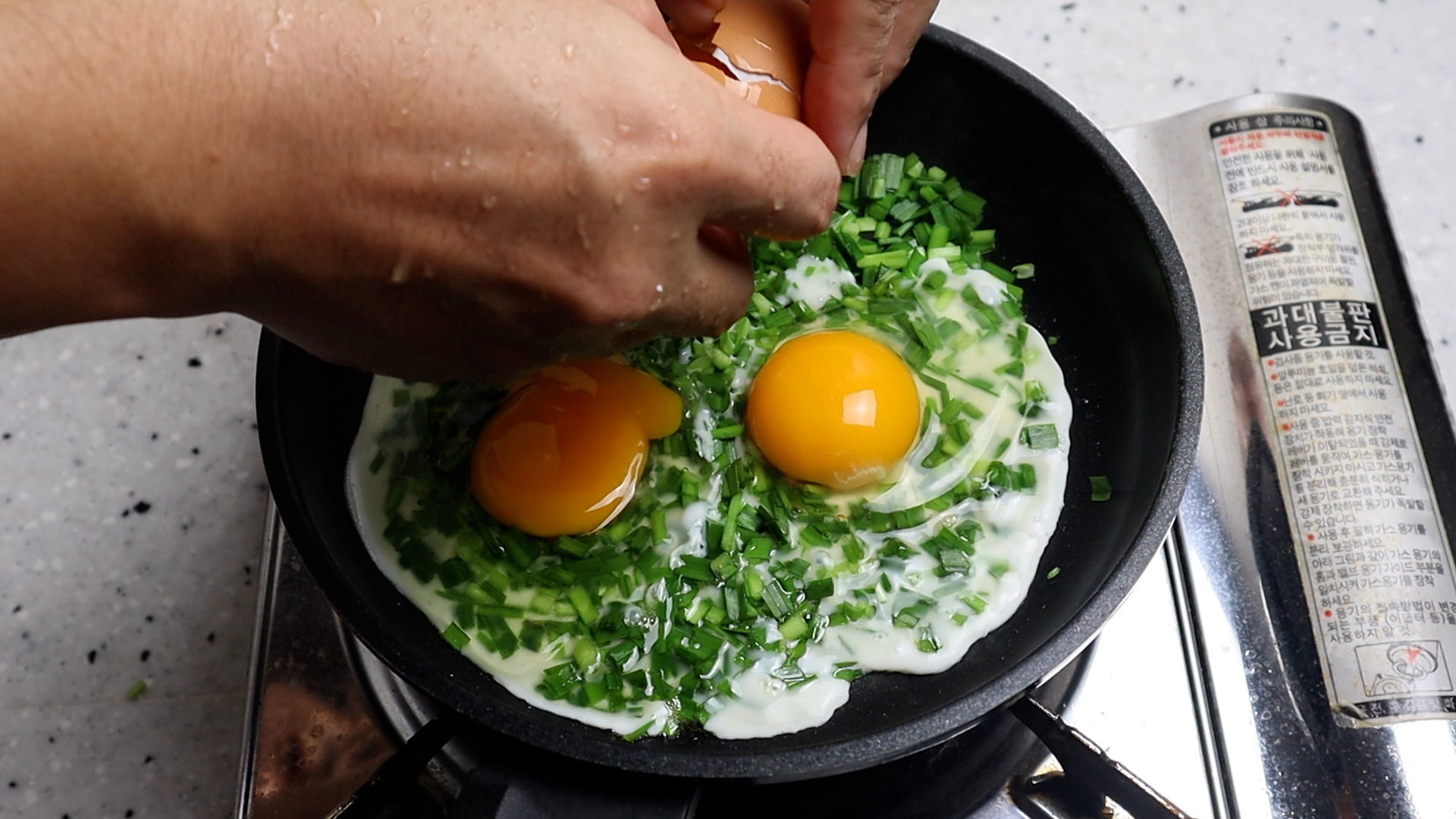 12. 부추를 팬에 골고루 펴주시고 그 위로 계란을 까올려주세요.