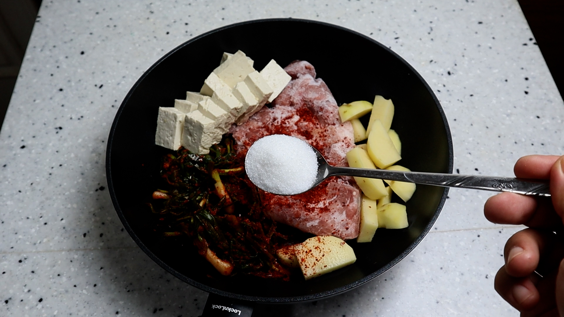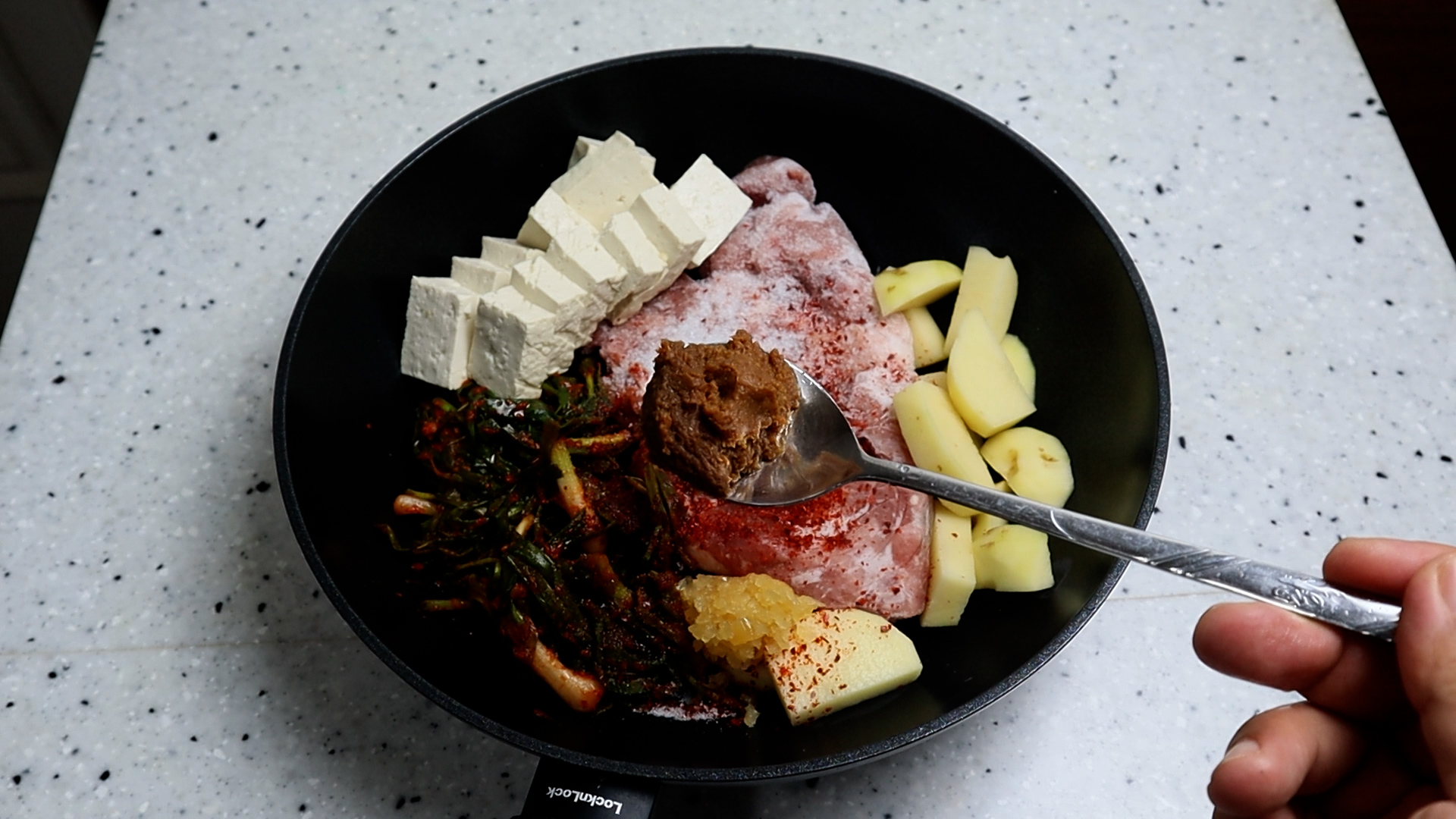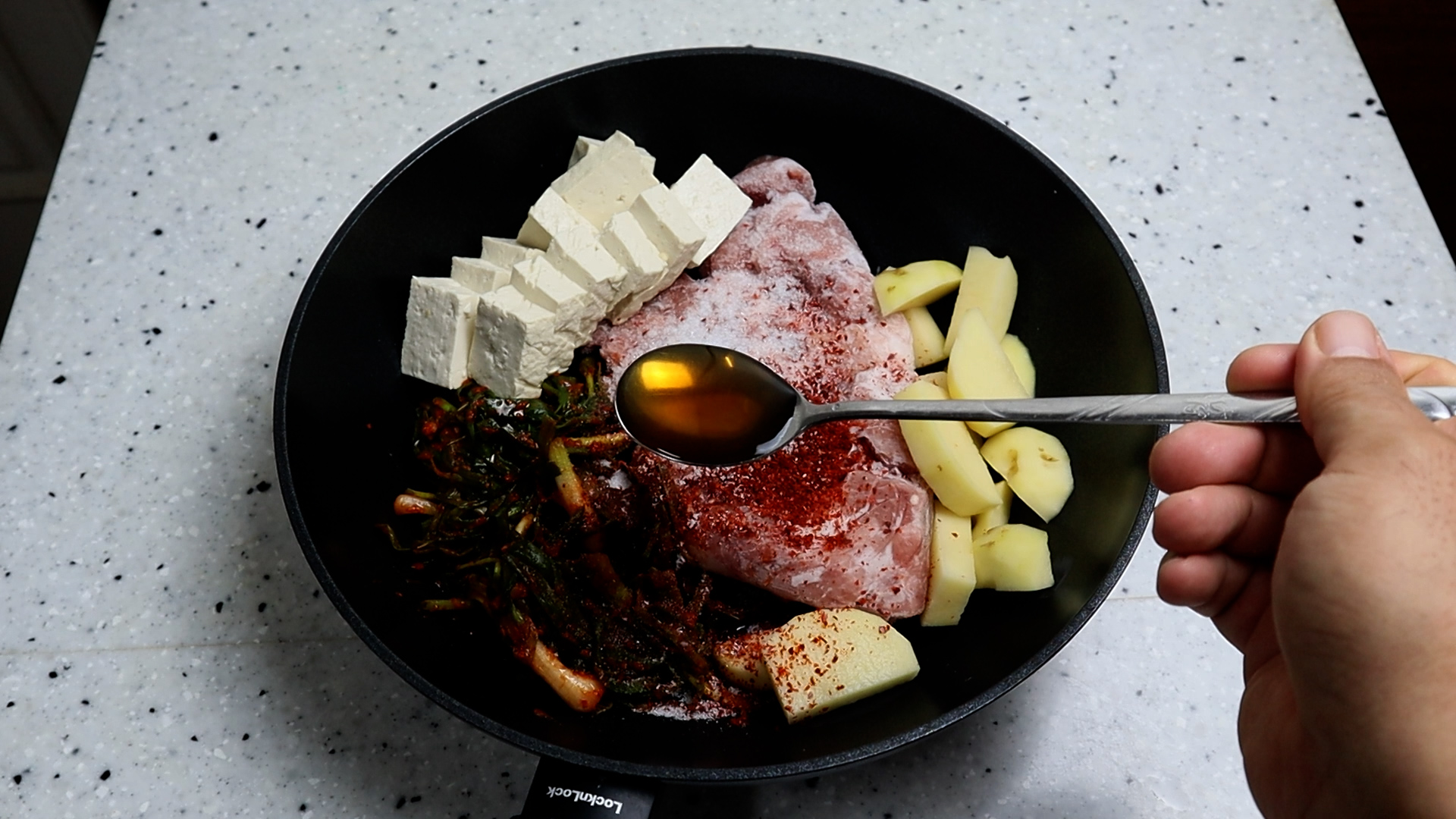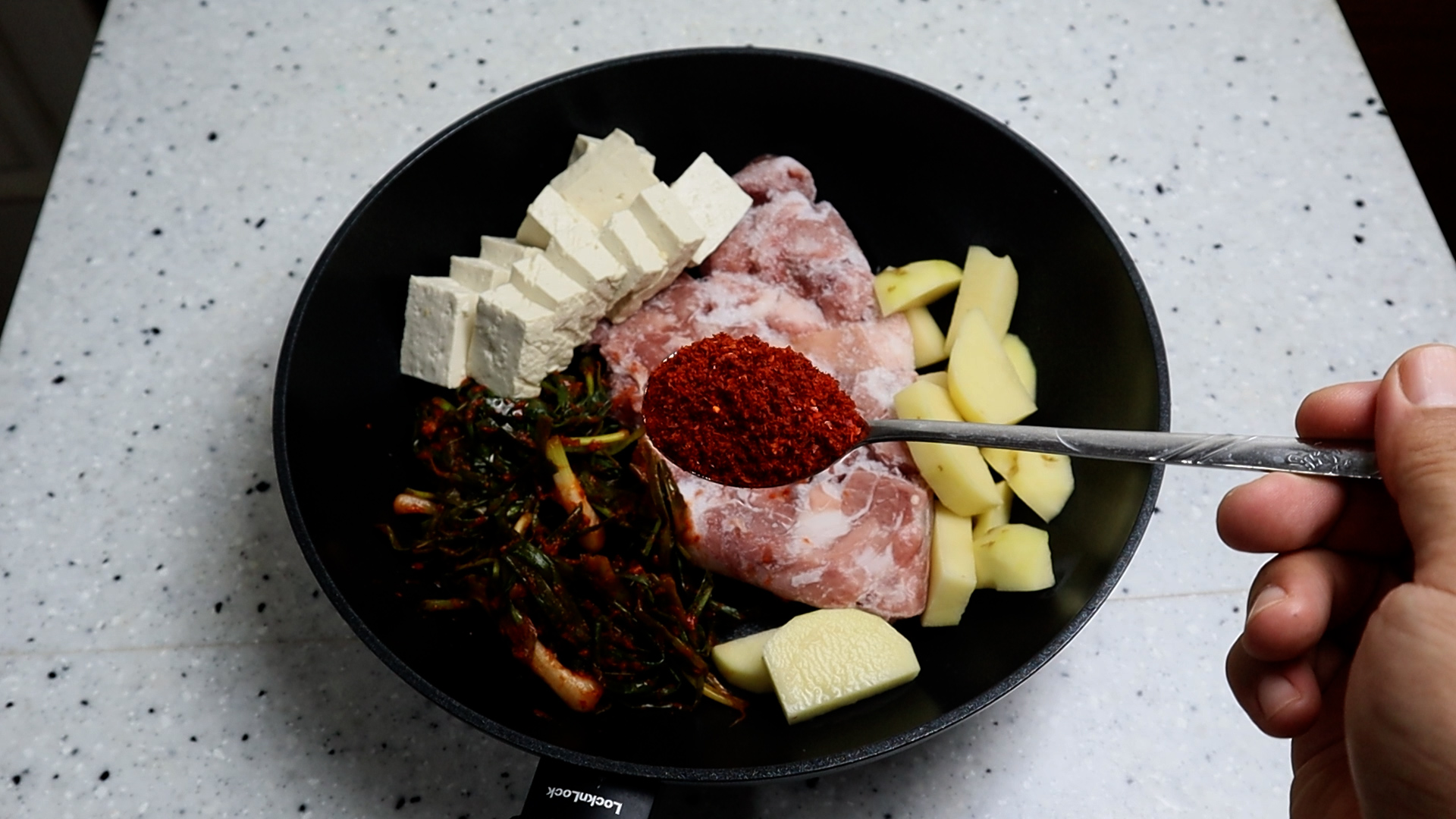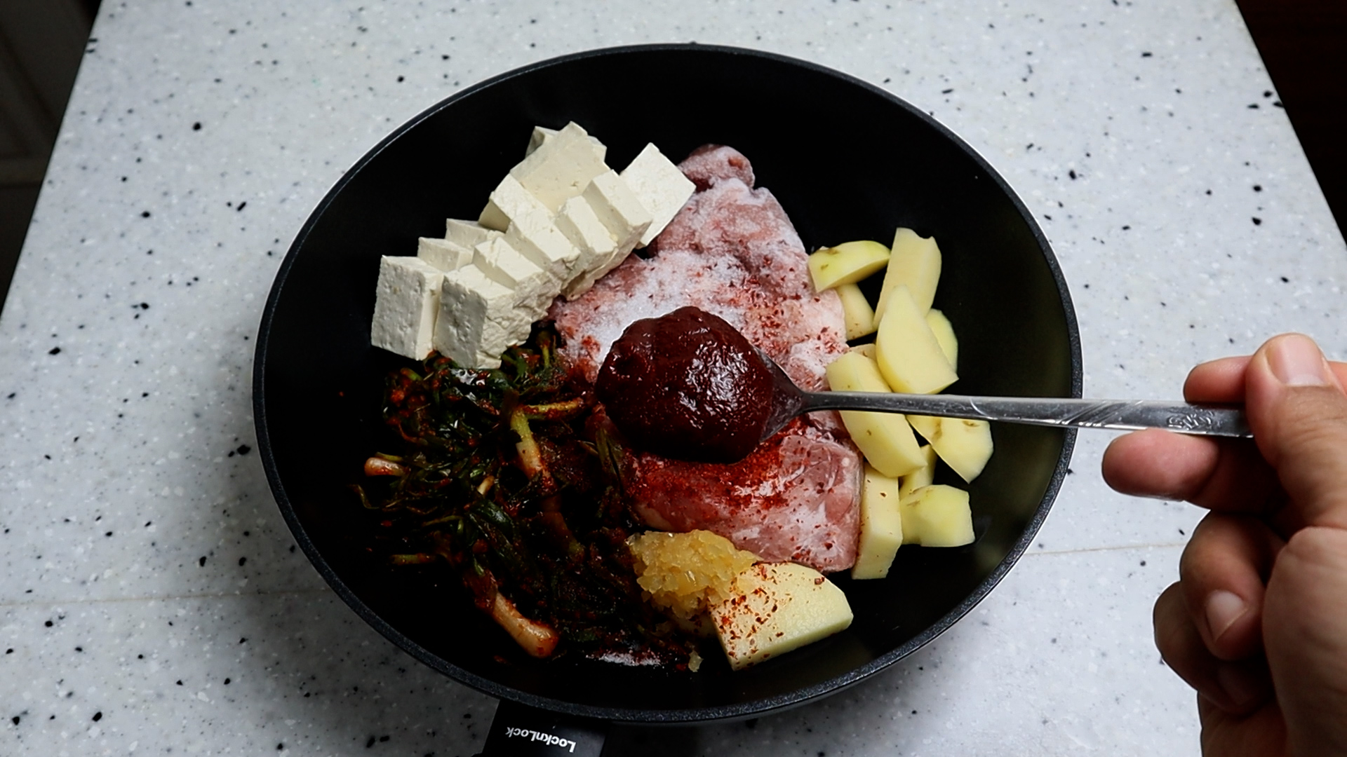 8. 두부와 감자도 넣어주시고 양념란에 적힌 재료를 전부 넣어주세요. 고춧가루 입자는 중간입자 고춧가루를 사용하세요.