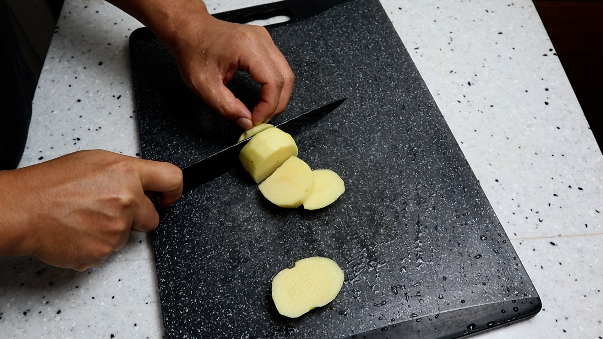 2. 감자 두께는 대략 1cm 정도로 썰어주시고 크기는 기호에 맞게 썰어주세요. 감자가 너무 두꺼우면 익지 않을수도 있으니 너무 두껍지 않게 잘라주세요.