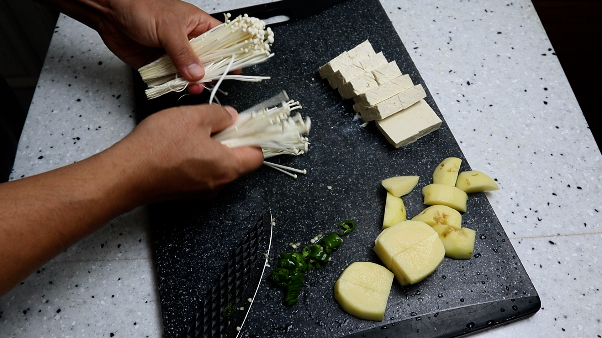 5. 팽이버섯은 먹기좋게 찢어주세요. 팽이버섯은 파는곳마다 100,150,300g 으로 포장단위가 상이하니 무게를 확인하고 준비하세요.