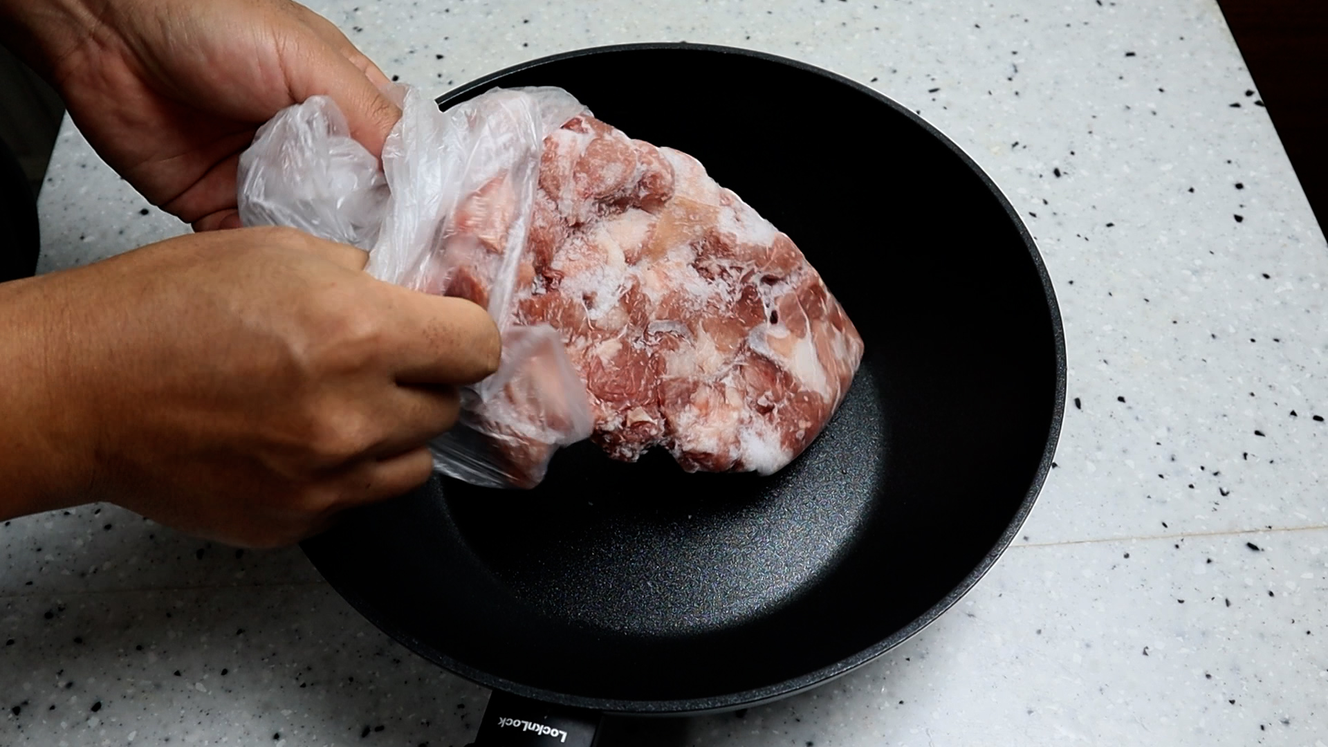 6. 돼지고기 앞다리살로 찌개용을 냄비 바닥에 깔아주세요. 펄펄 끓일거라 저는 냉동으로 소분해서 포장해놓은걸 사용했어요. 앞다리살이 수육용으로 저렴할땐 100g 에 850원씩 하는데 저는 그때 몇키로씩 사서 찌개용으로 썰어서 냉장고에 얼려놓고 쓰는 편이랍니다.