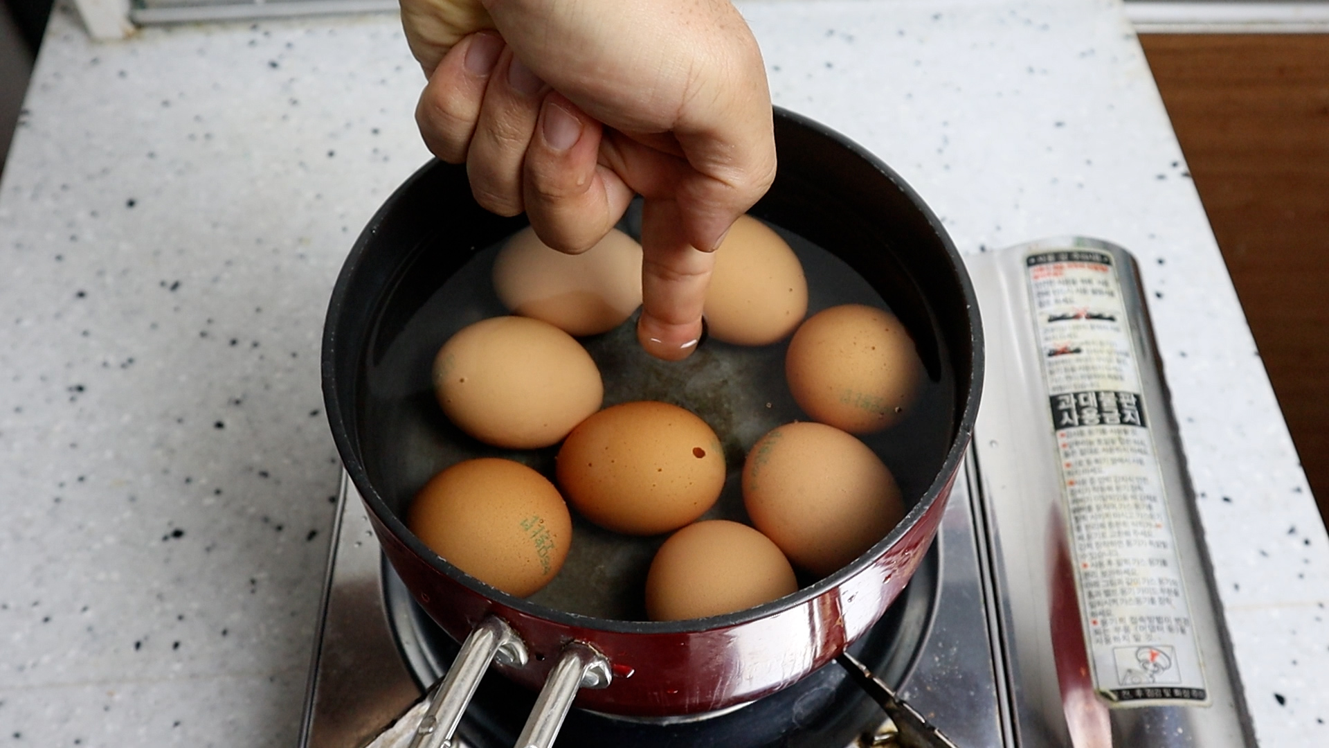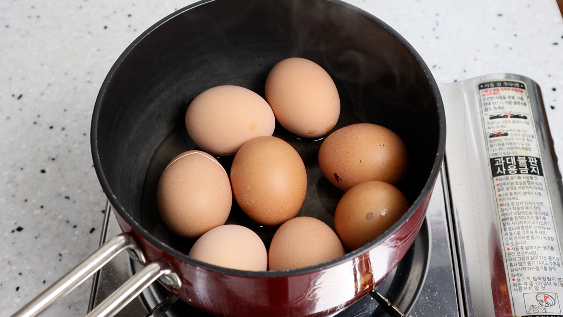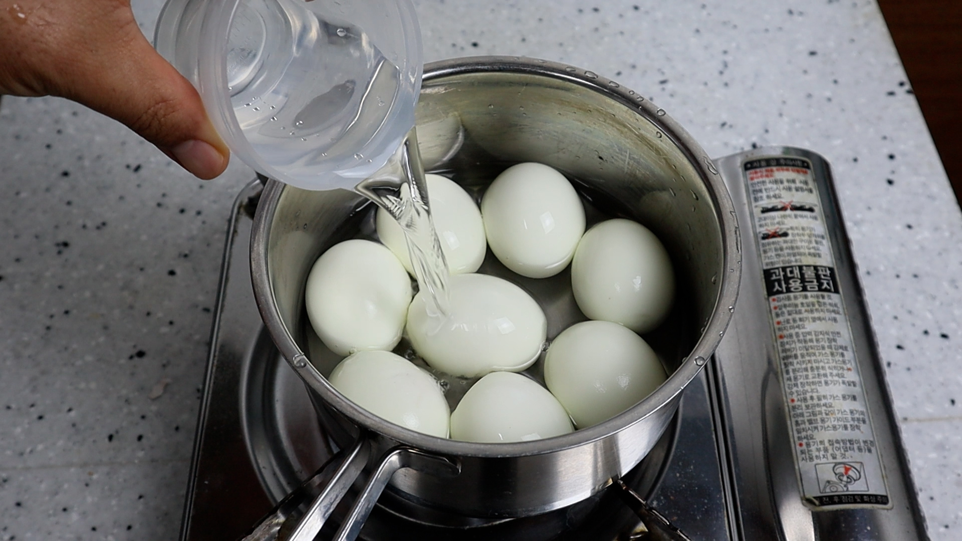 6. 깐 계란을 냄비에 넣고 물을 부어주세요.