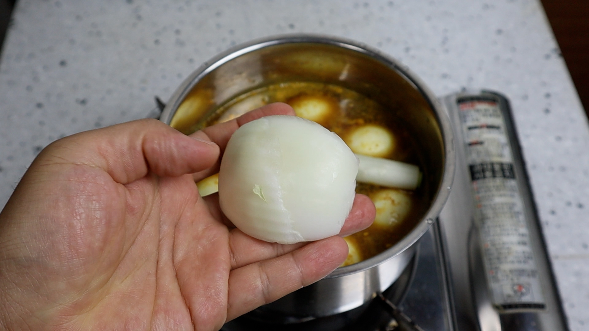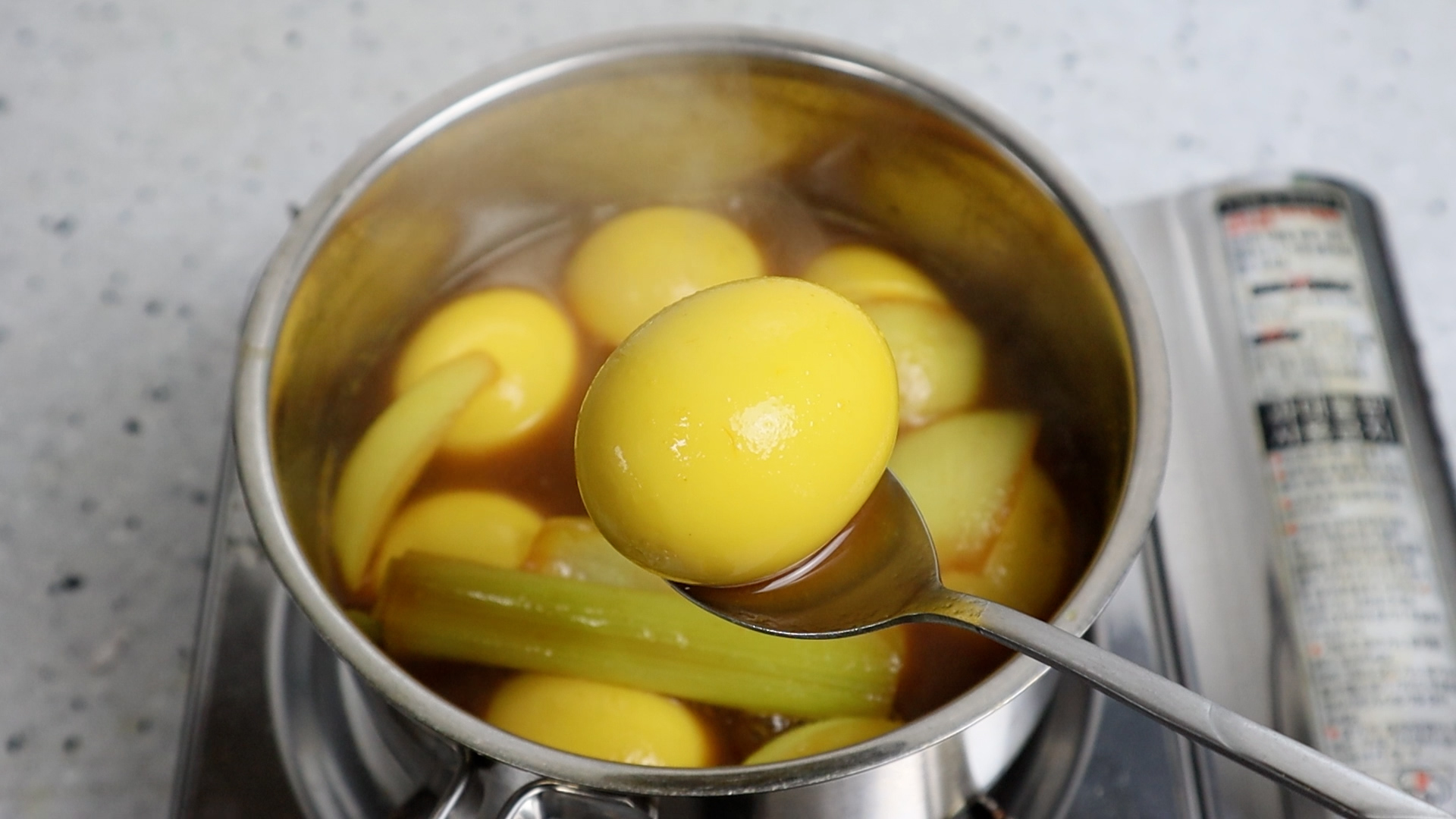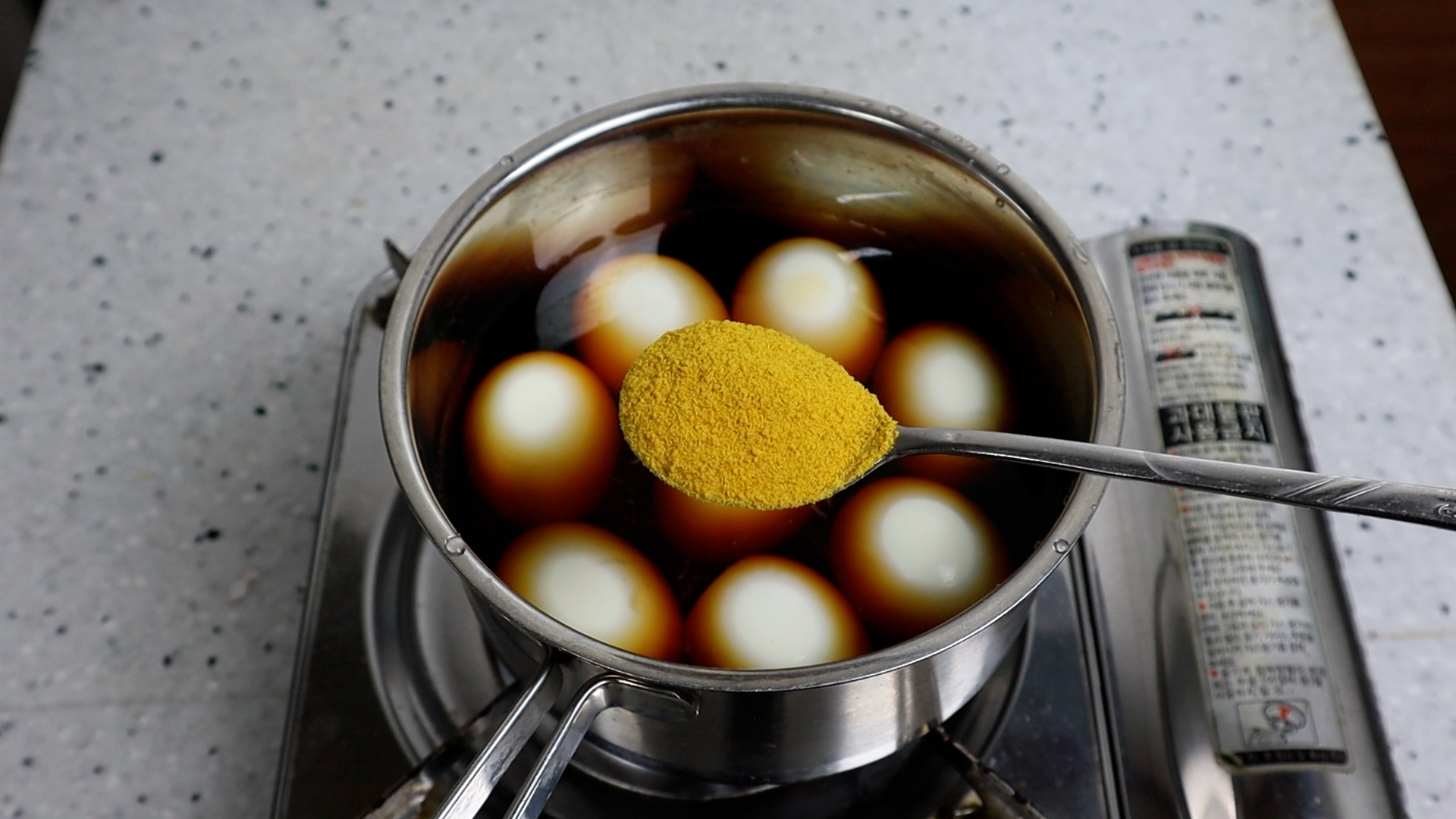 14. 7분 삶은 달걀은 이렇게 노란 카레빛 물들고 맛있는 향이 솔솔솔 날거에요.