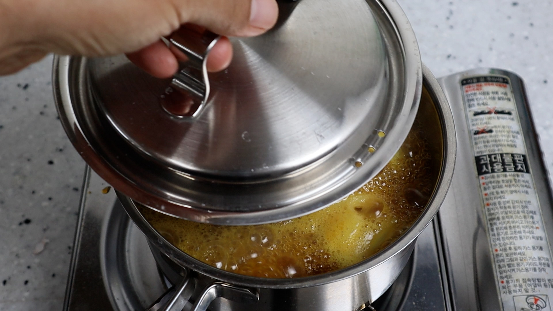 13. 소스가 부글부글 끓으면 불을 중불로 바꾸고 뚜껑을 덮고 7분 7분을 삶아주세요.