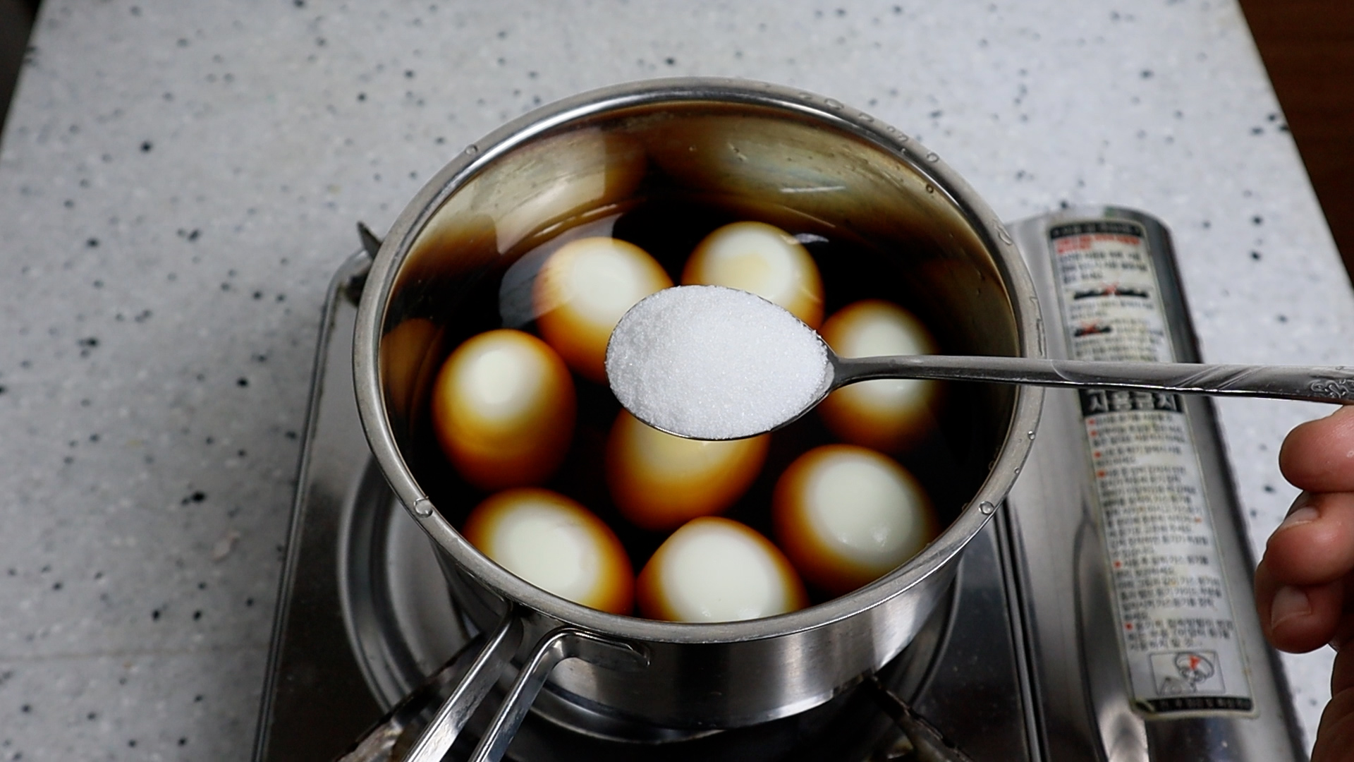 10. 오늘 달걀장조림의 키포인트! 카레가루도 넣어주세요. 설탕과 같은 2스푼인데 무게가 다른이유는 카레가루와 설탕의 밀도차에서 오는 무게 차이입니다.