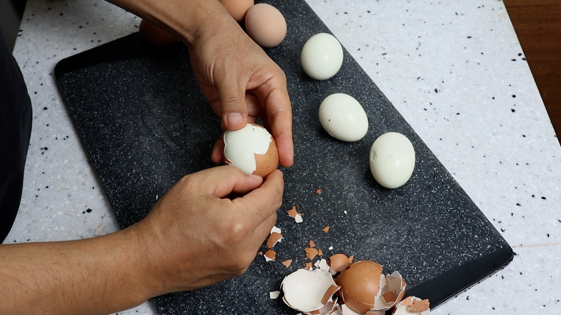 5. 계란은 기호에 맞는 방식으로 깐다음 찬물에 한번 씻어 계란 껍질을 제거해주세요.