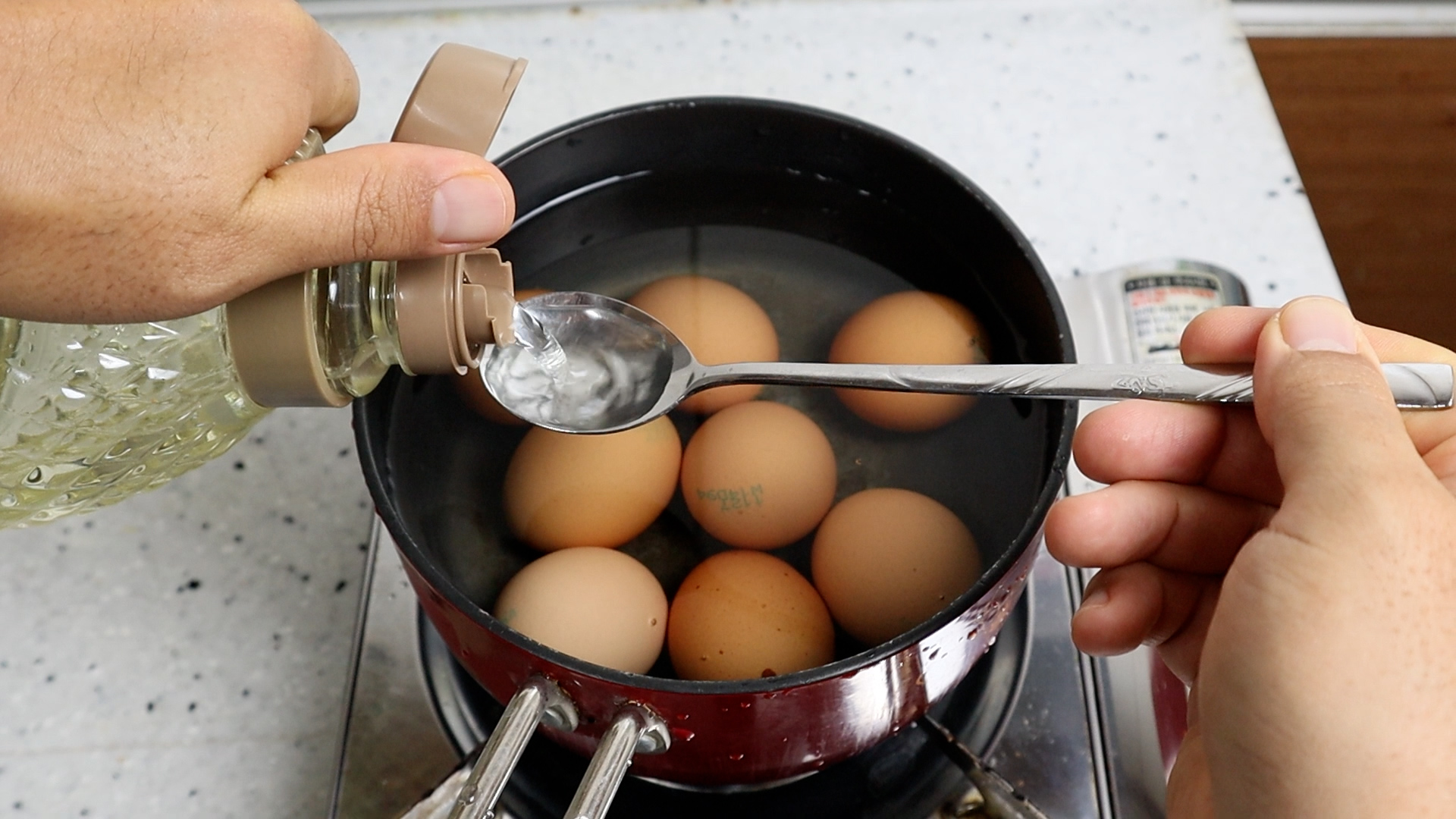1. 냄비에 물 1리터를 붓고 계란 8알을 넣고 식초를 넣은 다음 가스불을 켜주세요.