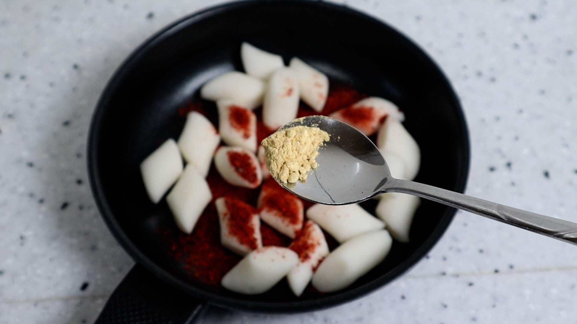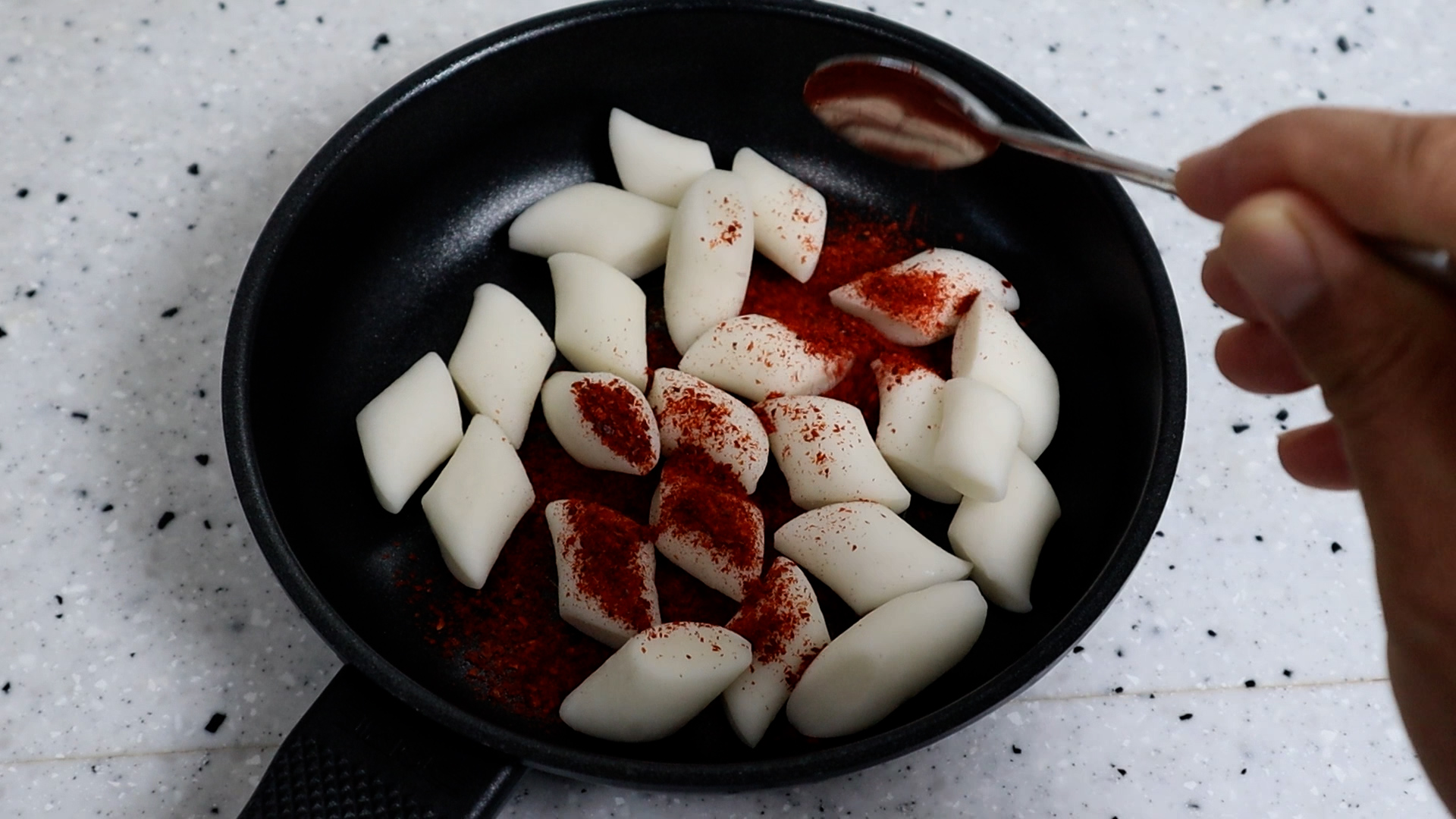 2. 계란구울때나 쓰는 작은 팬에 떡을 넣고 어묵을 넣어줘야 하는데 어묵이 없는 경우 떡을 40g 추가해주세요.