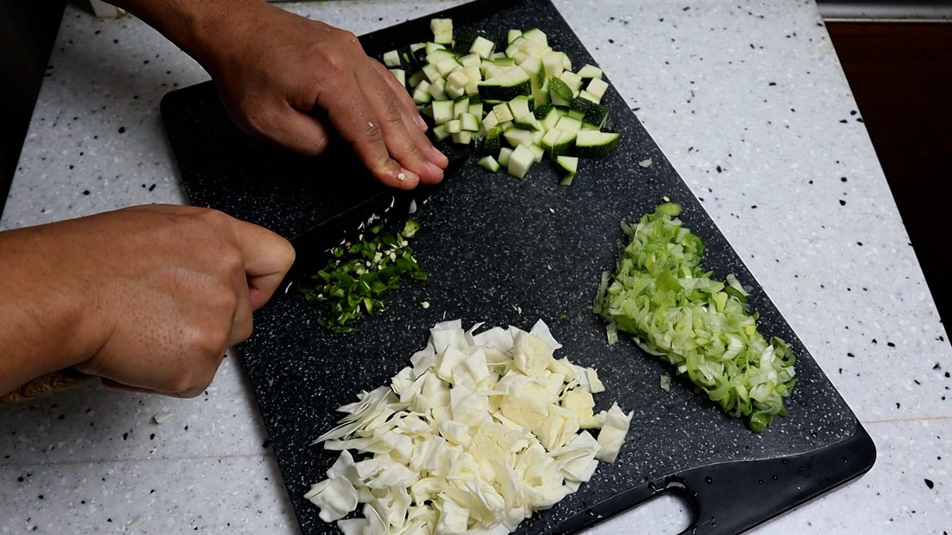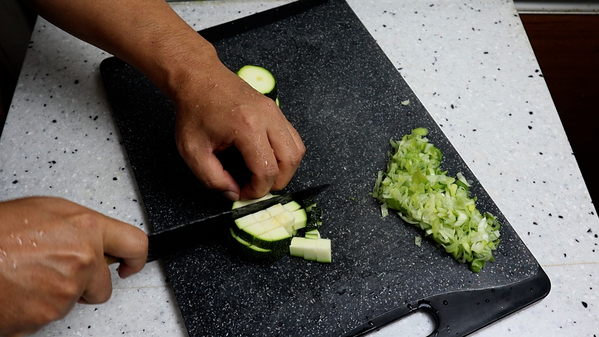 10. 호박은 1cm 정도 크기로 깍둑썰어주세요. 긴호박 애호박 아무거나 사용하셔도 됩니다. 참고로 애호박 1개가 280~300g 정도가 나가더라고요.