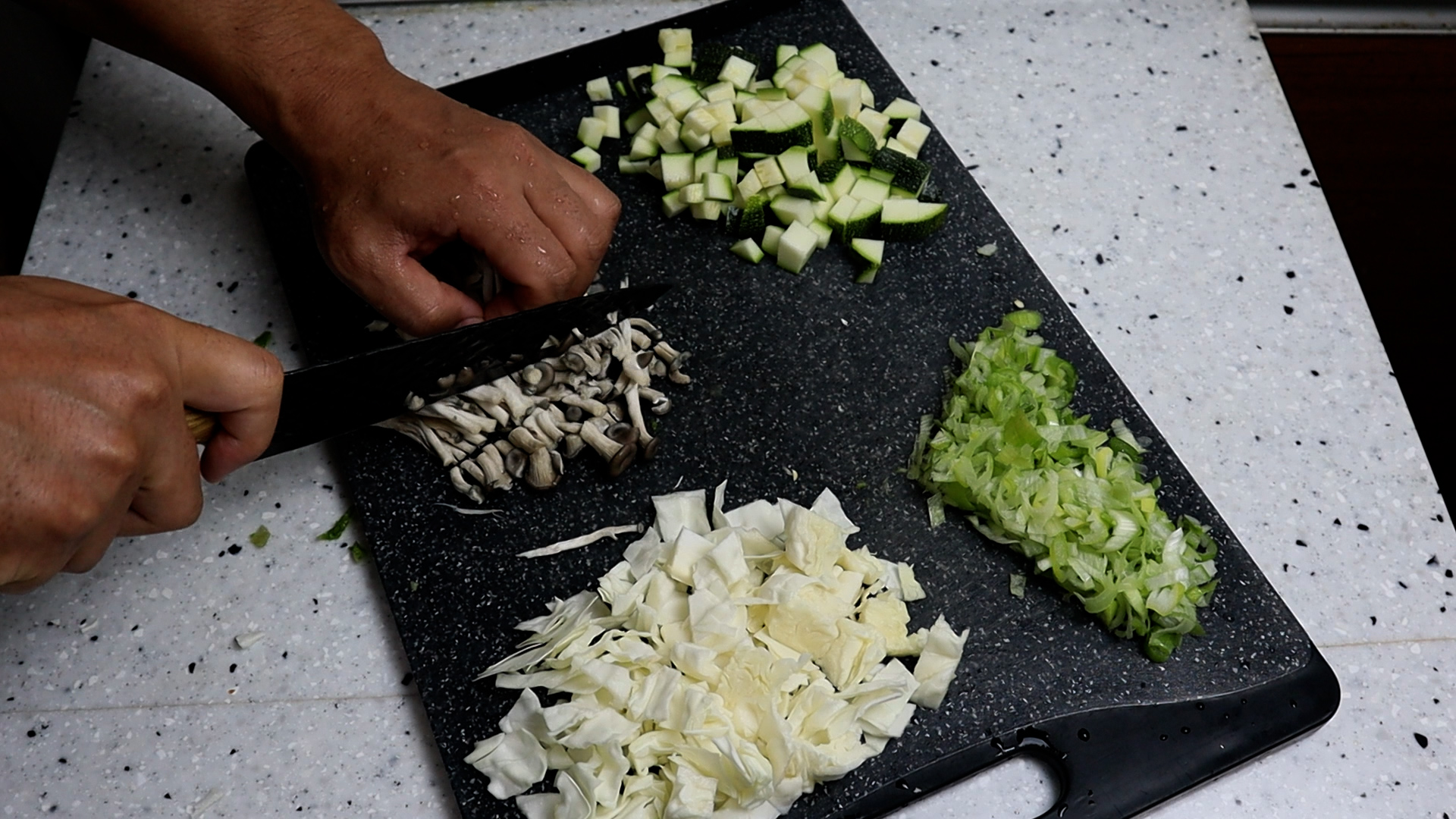 14. 버섯을 1cm 정도 크기로 썰어주세요. 느카리 대신 새송이버섯도 좋습니다.