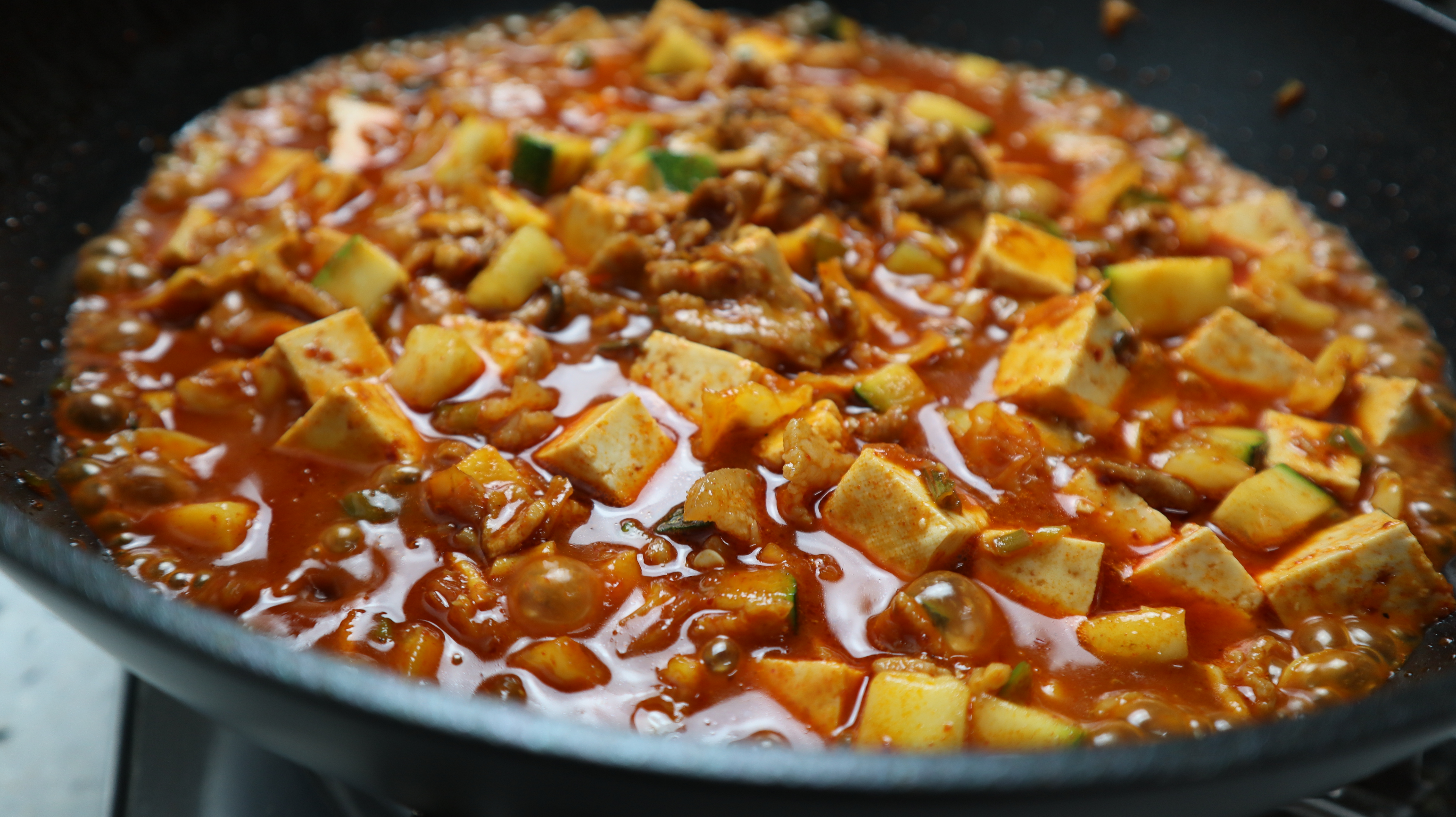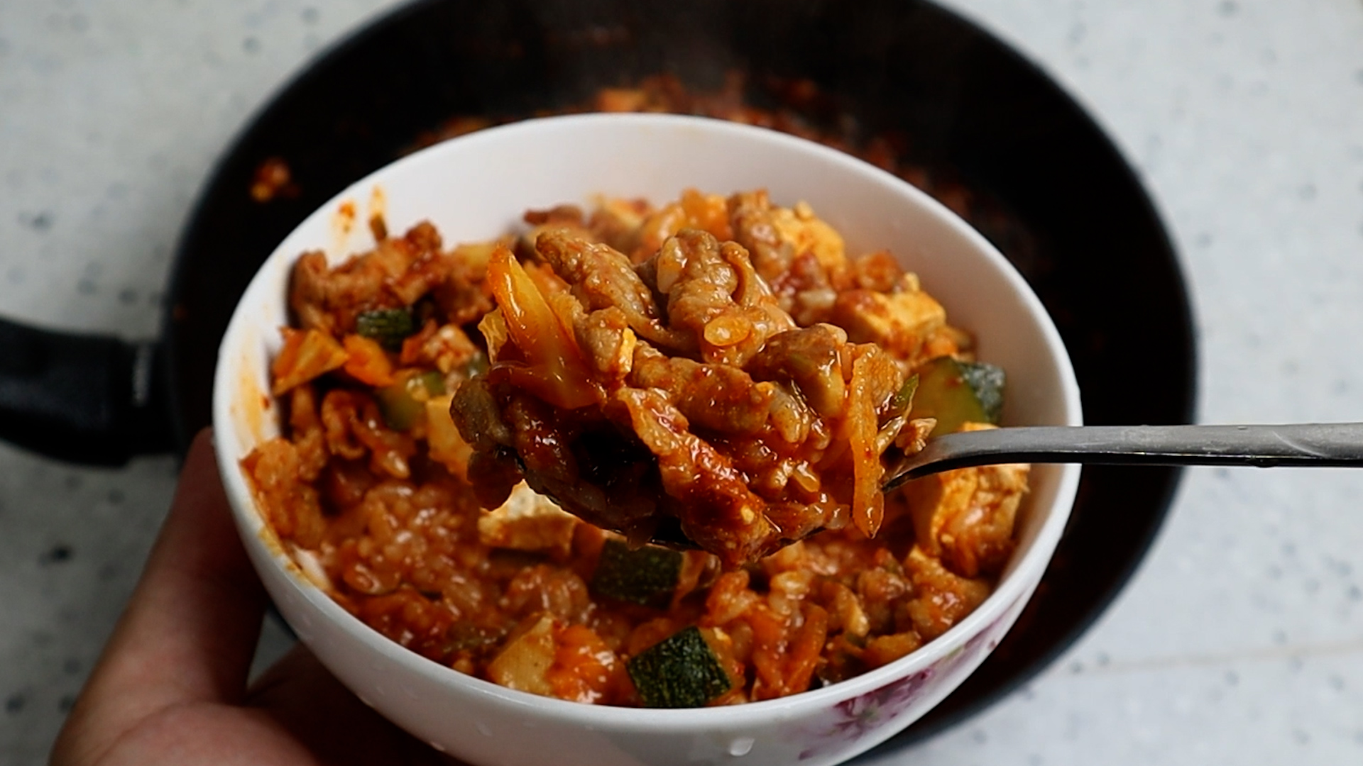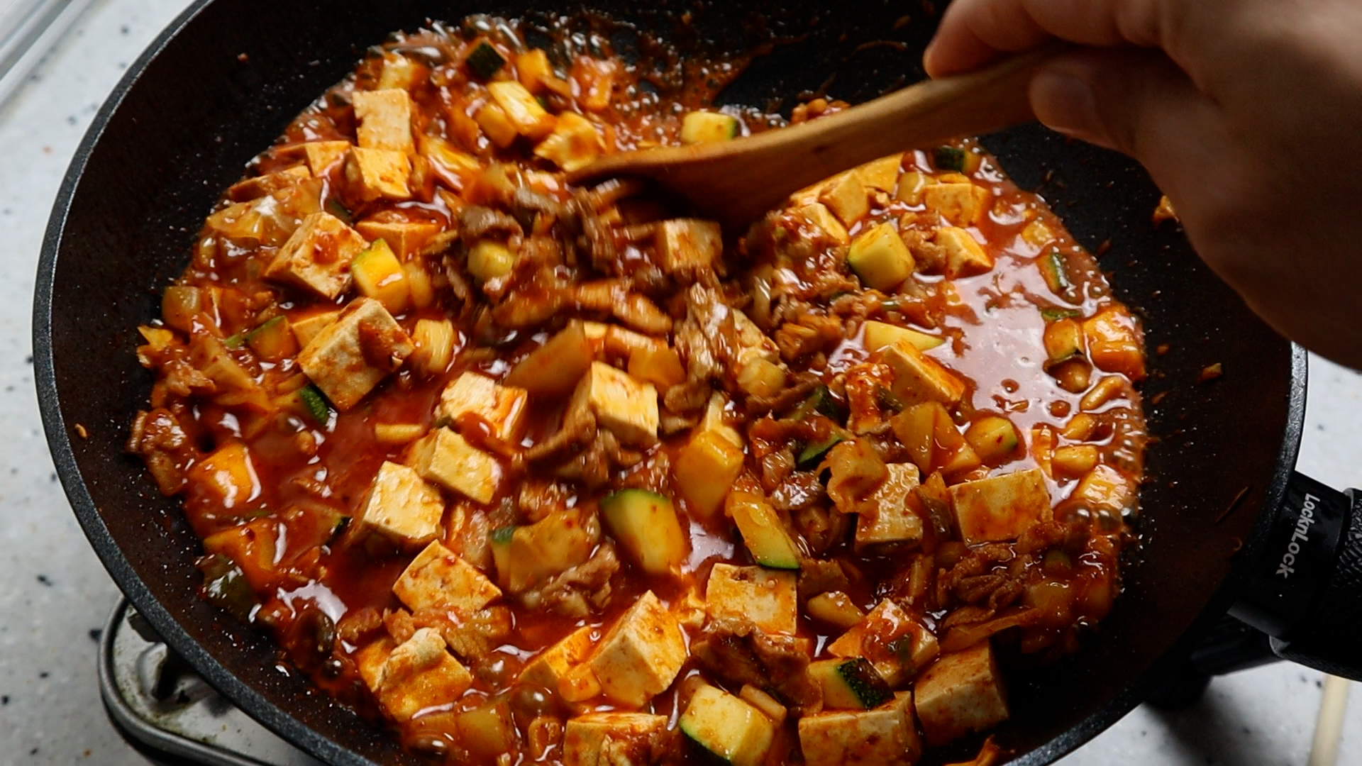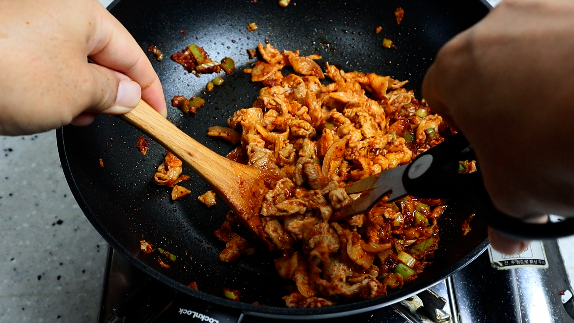 18. 간 돼지고기를 넣고 2분정도 볶아주세요. 얇은 삼겹살이나 앞다리살이 있다면 그걸로 넣고 볶은 다음 가위로 잘게잘게 잘라주세요. 가위로 자를 때는 불을 살짝 끈다음 잘라주시고 팬을 직접 긁지 말고 저 처럼 나무숟가락 위를 바닥삼아 잘라주시면 코팅도 안벗겨지고 좋습니다.