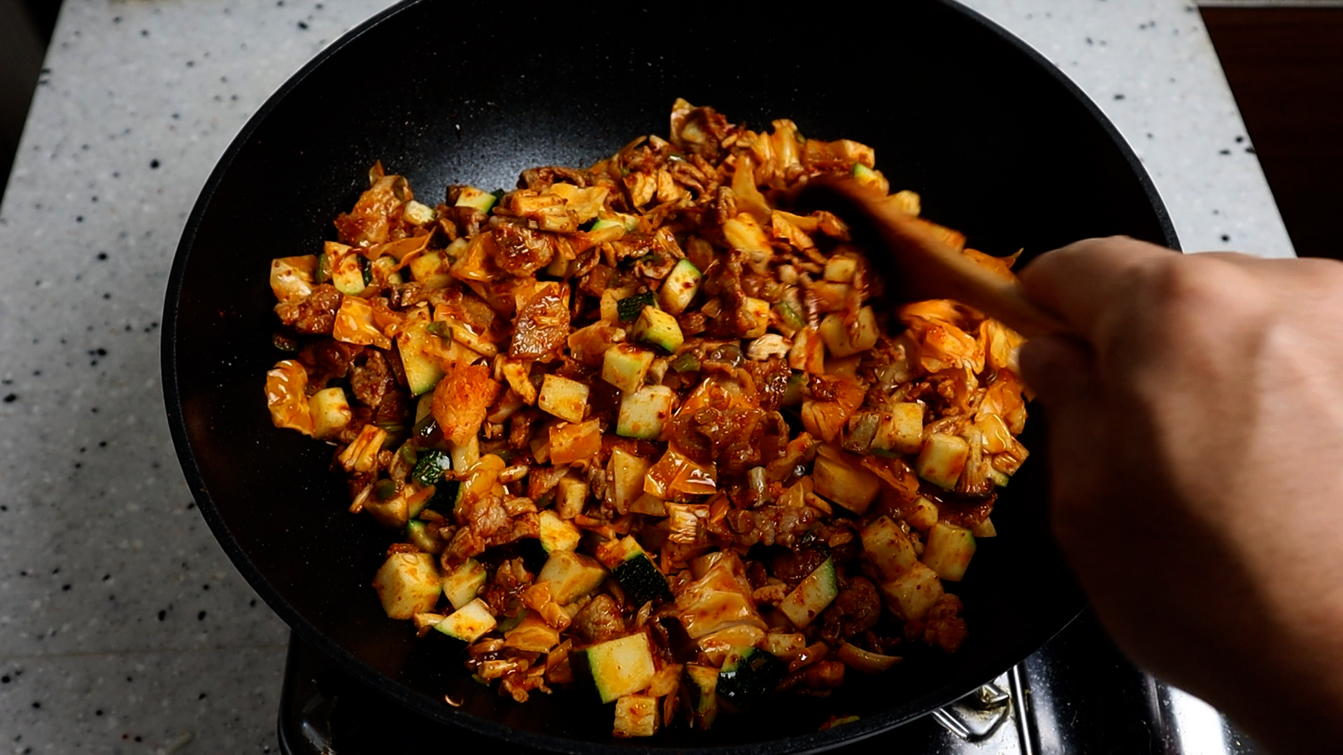 19. 야채를 전부 넣고 강불 유지하고 2분을 볶아주세요. 강불에 볶아야 야채 수분이 덜 나온답니다.