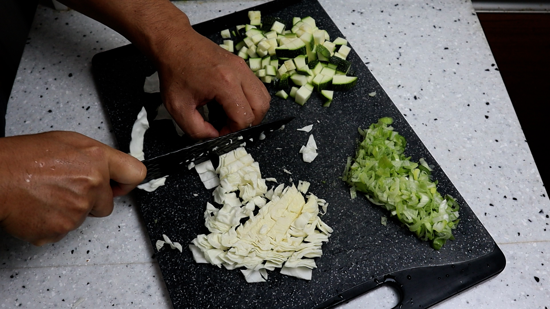 11. 양파 반개를 잘라야 하는데 집에 양파가 똑~ 떨어져서 이번엔 양배추로 대체를 했어요! 양파 있으시면 양파를 사용하시고 크기는 양파든 양배추든 2cm 정도 크기로 썰어주세요.