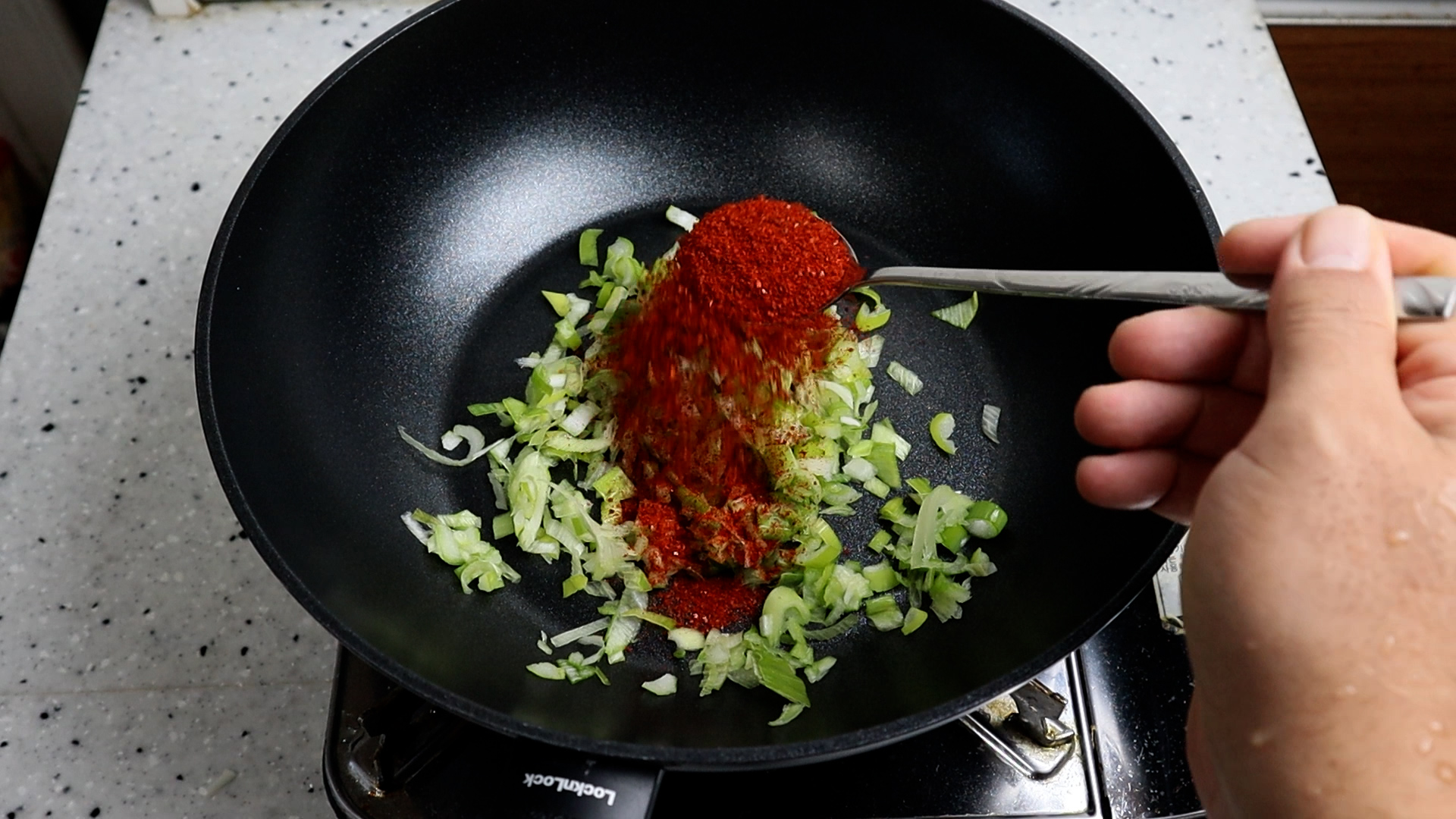 16. 팬에 대파를 넣고 고춧가루를 뿌린 다음 식용유도 골고루 뿌려주세요. 찌개 풍미를 확 살려줄 파기름 고추기름을 한번에 만들거에요.