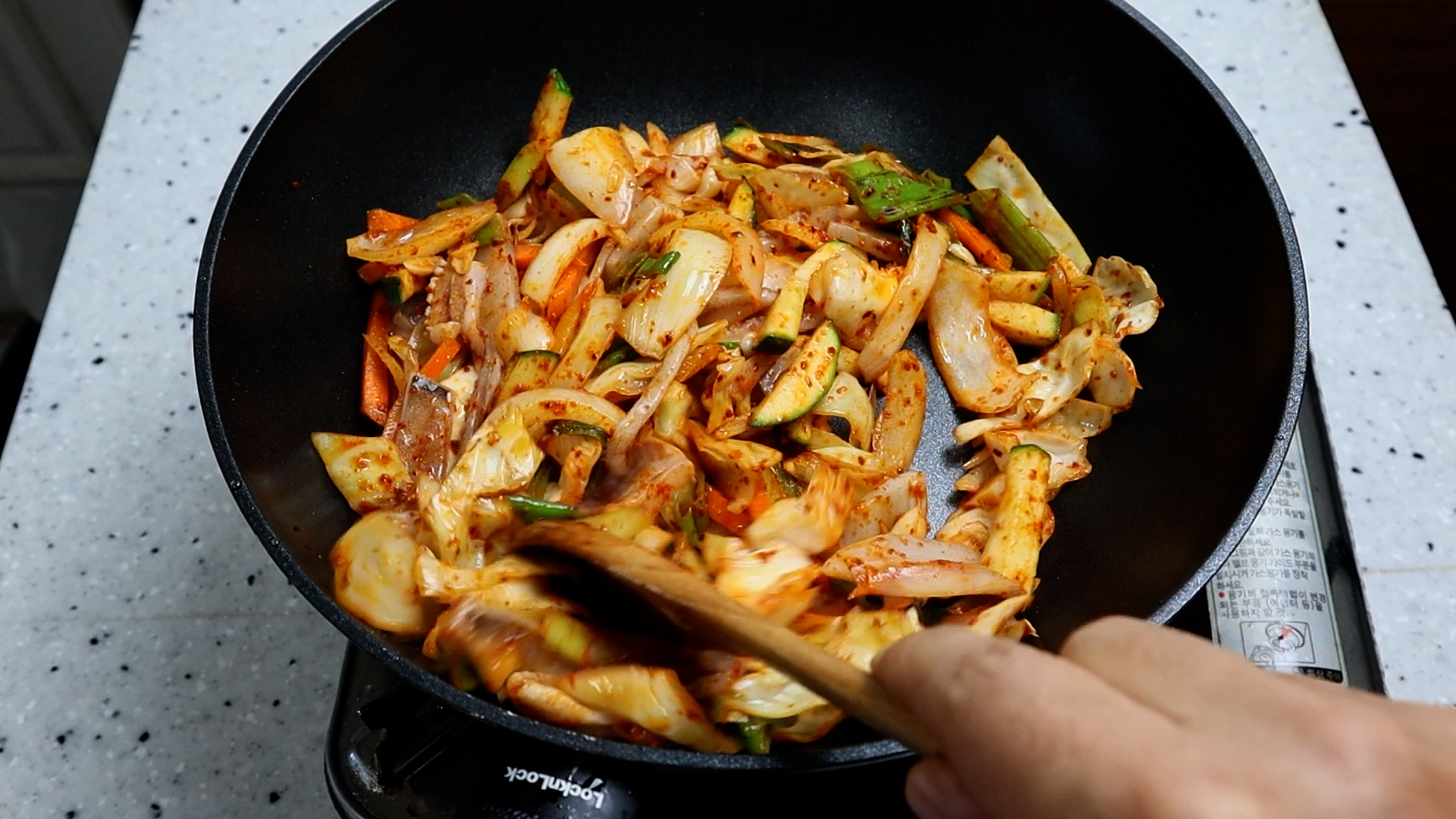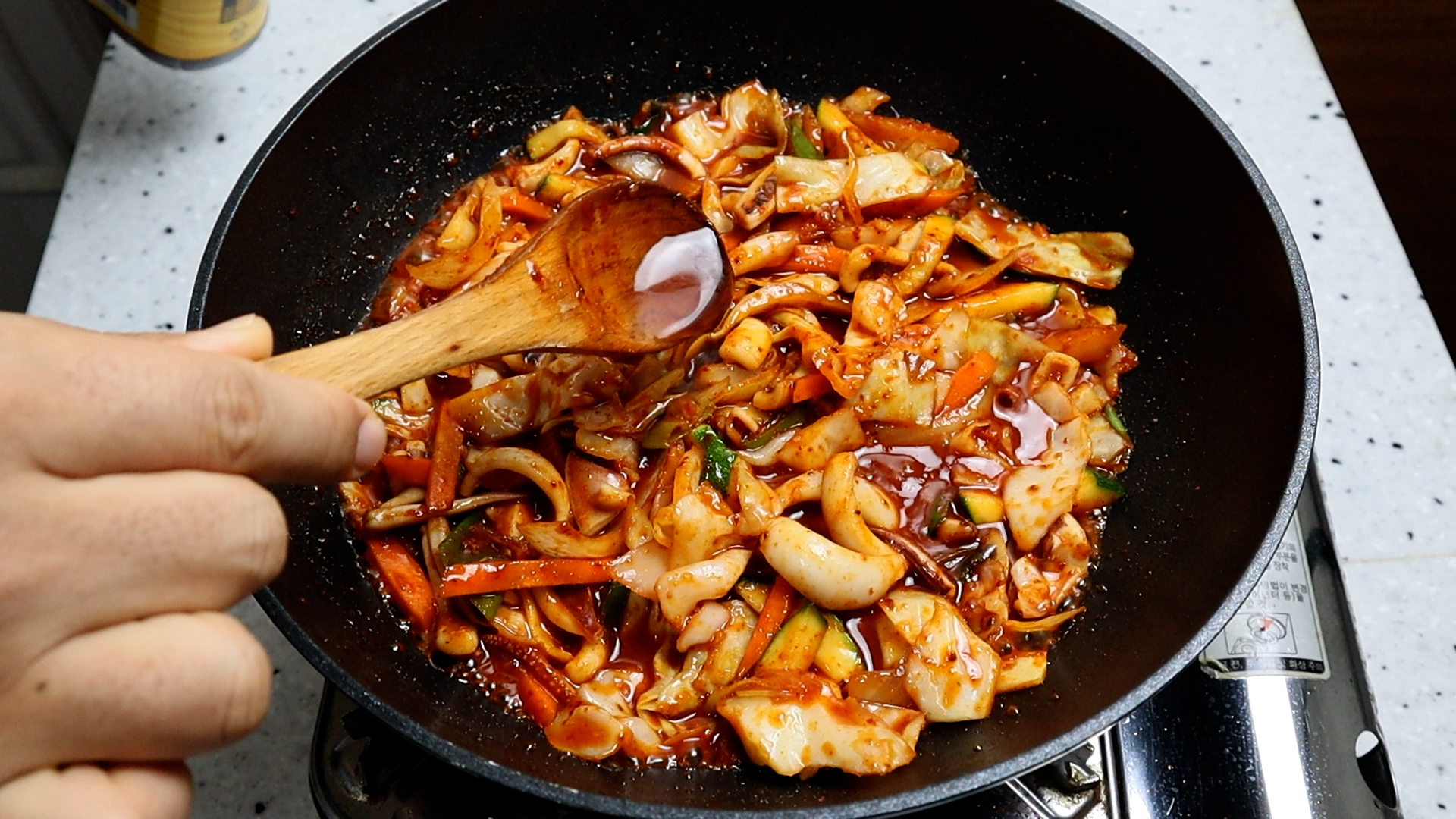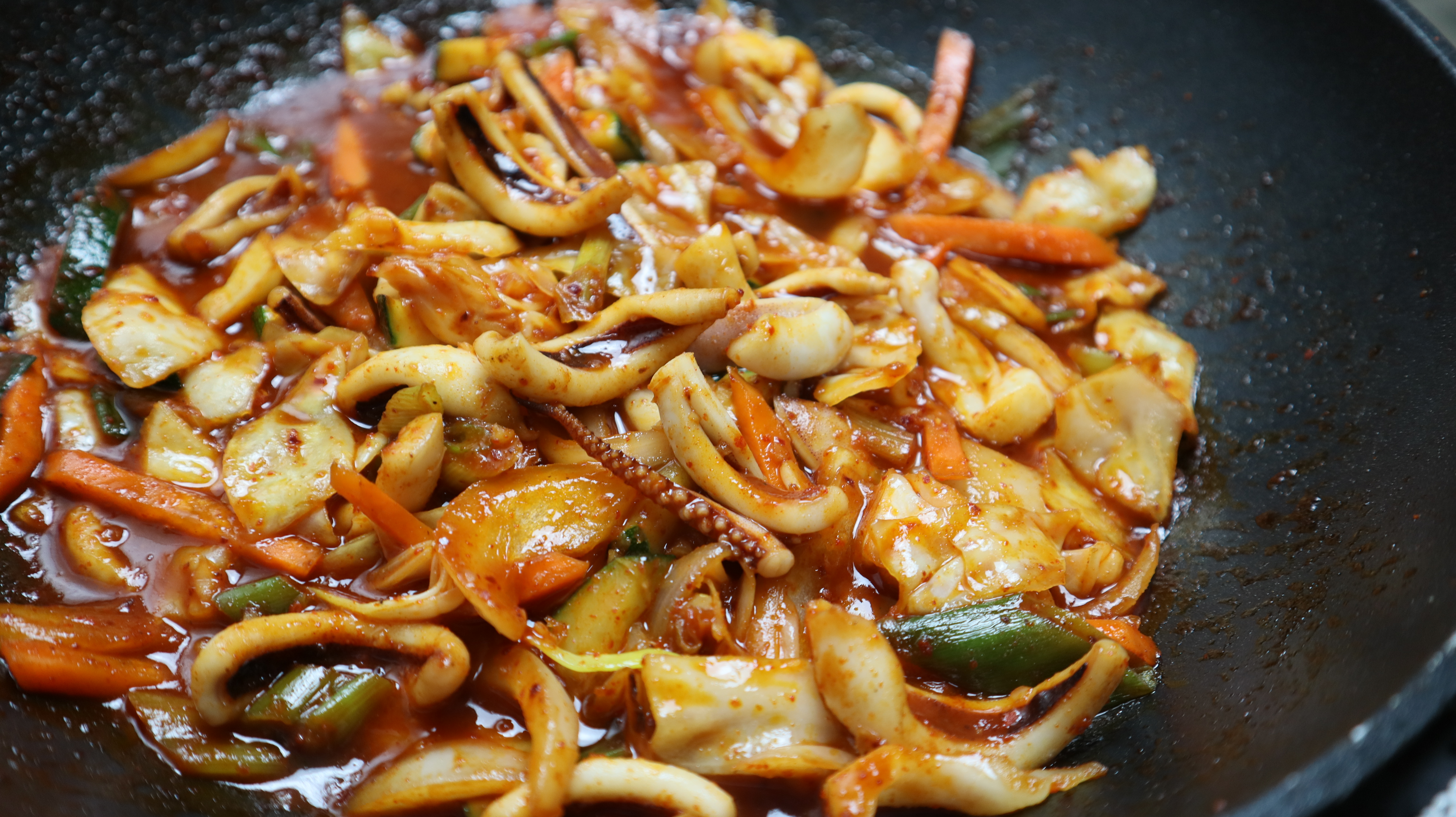 17. 오징어를 넣고 2분 정도를 볶아주세요.