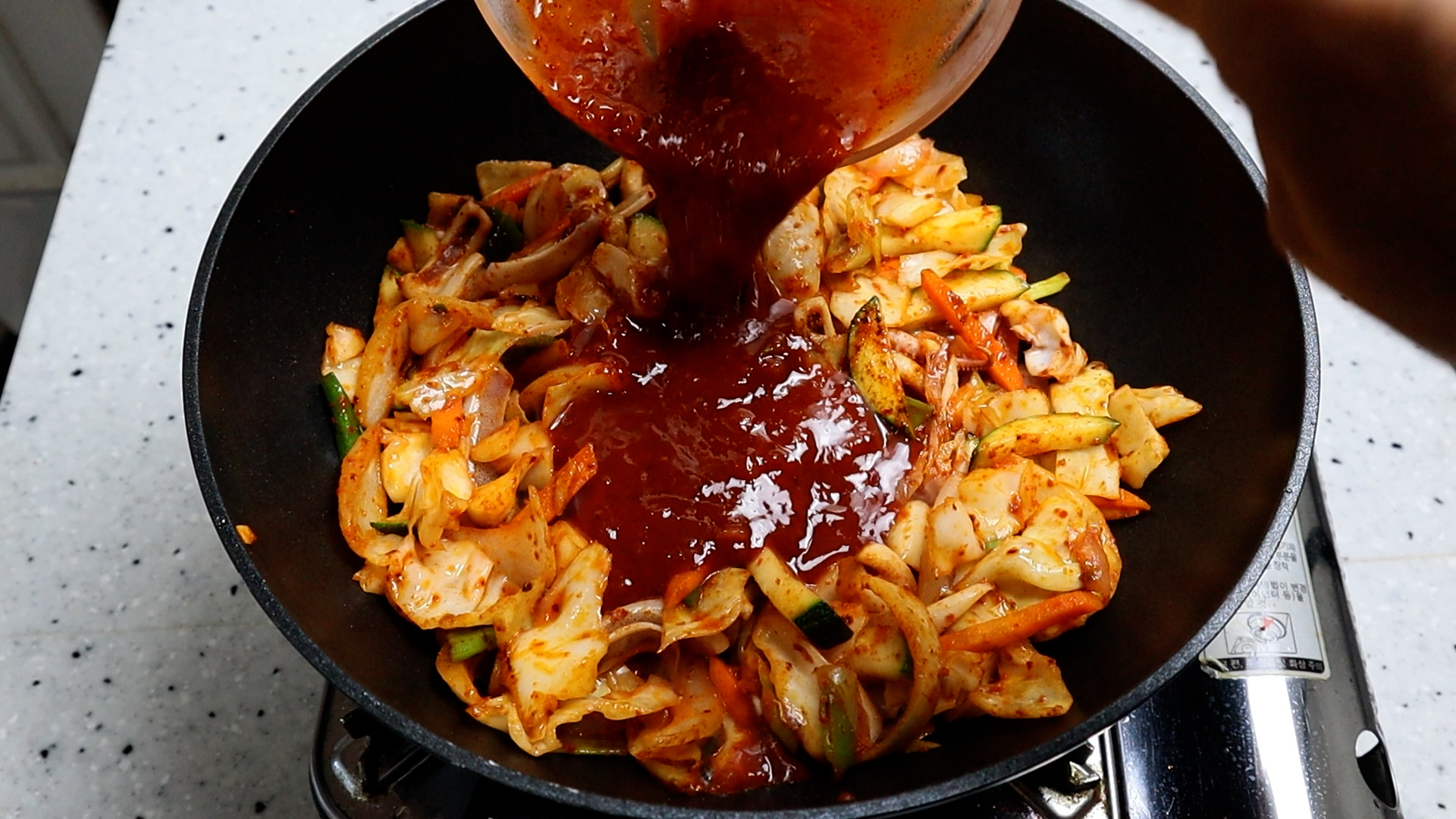 18. 양념장은 남김없이 부어주세요. 물엿이나 설탕이 바닥에 들러붙어 있을수 있으니 남김없이 넣어주세요. 그래야 양념 벨런스가 너무 짜지는 일이 없습니다.
