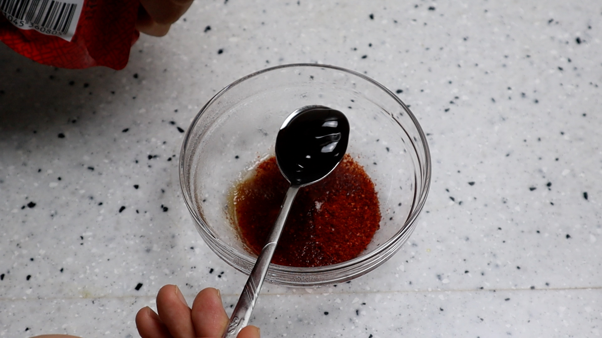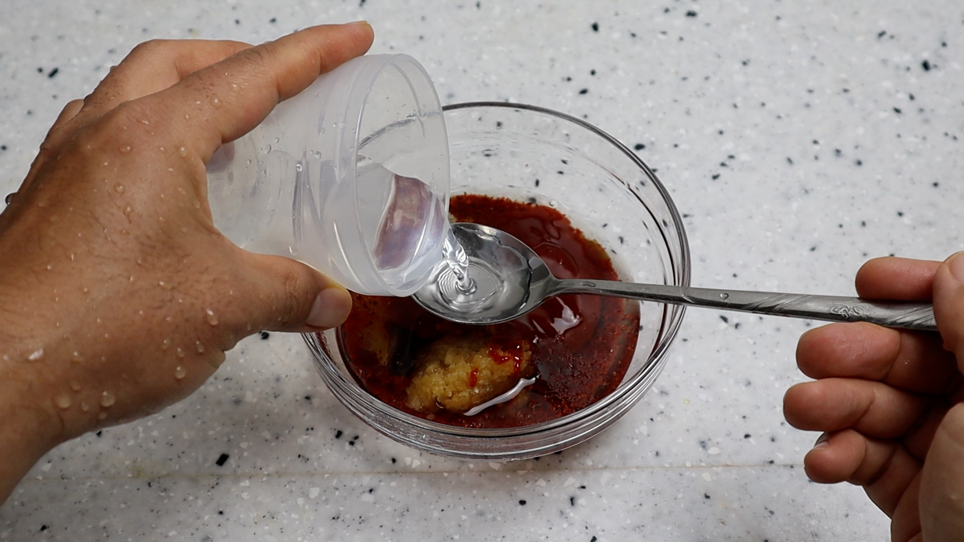 13. 물엿을 넣고 맹물을 넣어주세요. 물엿 대신 올리고당을 사용하실거면 이소말토 올리고당으로 물엿의 80% 정도만 넣으시고 물은 수분감이 많은걸 안좋아하시면 50cc 를 넣으시고 적당히 질척한 양념 수분이 있는게 좋으시면 100cc 를 부으세요.