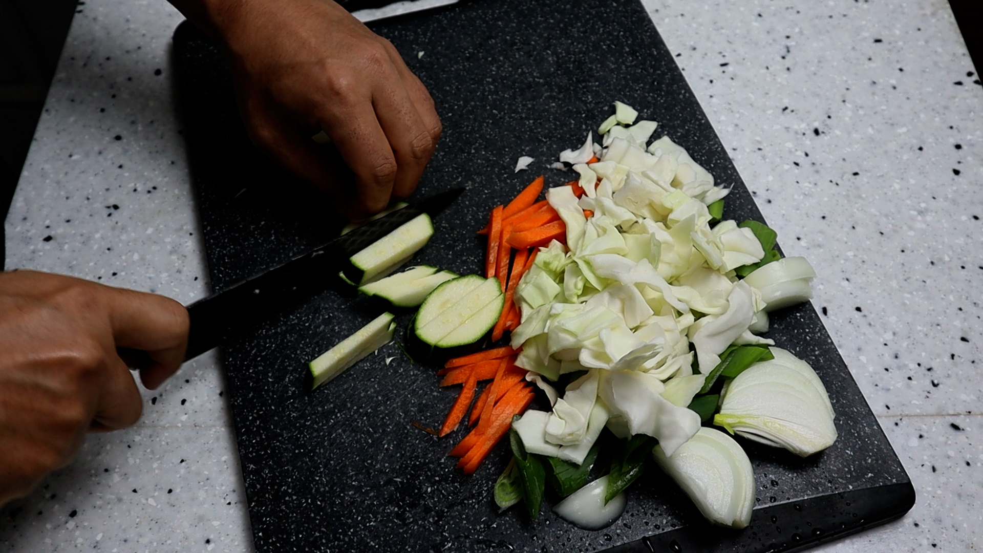 5. 긴호박이나 애호박을 0.5cm 두께로 4~5조각 썰어서 0.5cm 두께로 채썰어주세요. 김천 스타일!!! 야채 지옥이라 불릴정도로 야채가 듬뿍 들어가줘야 제맛 아니겠습니까!
