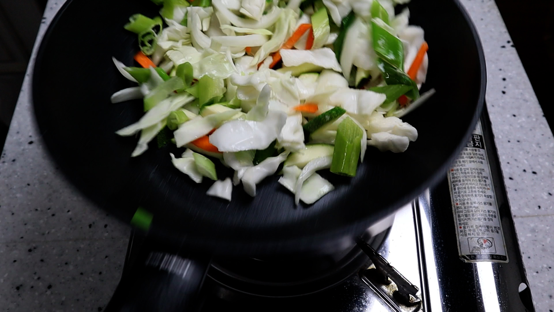 15. 팬에 식용유를 넣고 불을 강불로 올려 기름이 달궈지면 야채를 전부 넣고 1분 정도 섞어가며 볶아주세요. 물이 강해서 야채를 초반에 겉면을 익혀 속에 수분을 잡아줘야 국물이 너무 흥건~~ 해지지 않습니다.