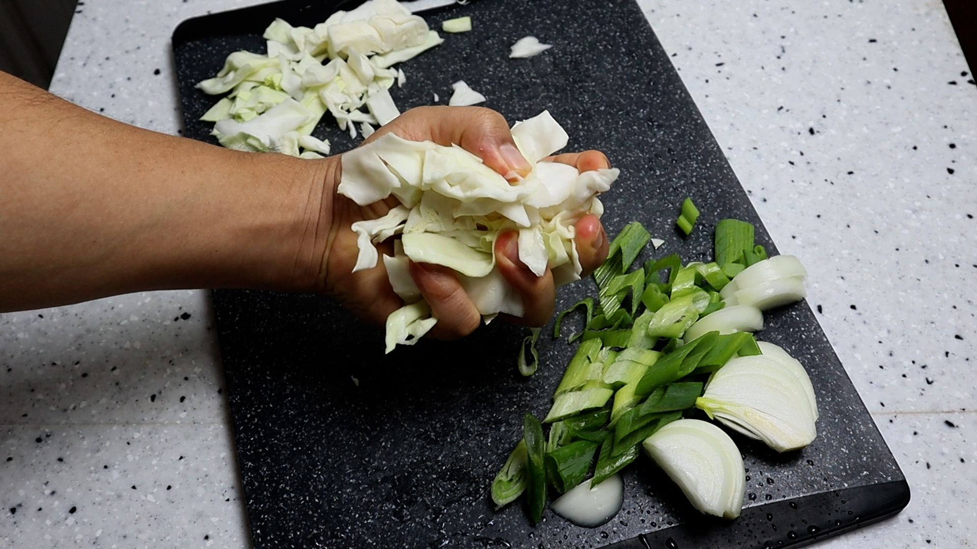 3. 양배추는 폭 2cm 길이는 4~5cm로 길쭉하게 썰어주세요. 무게가 애매하시면 주먹으로 이정도 잡아서 2주먹 정도 준비하시면 됩니다.