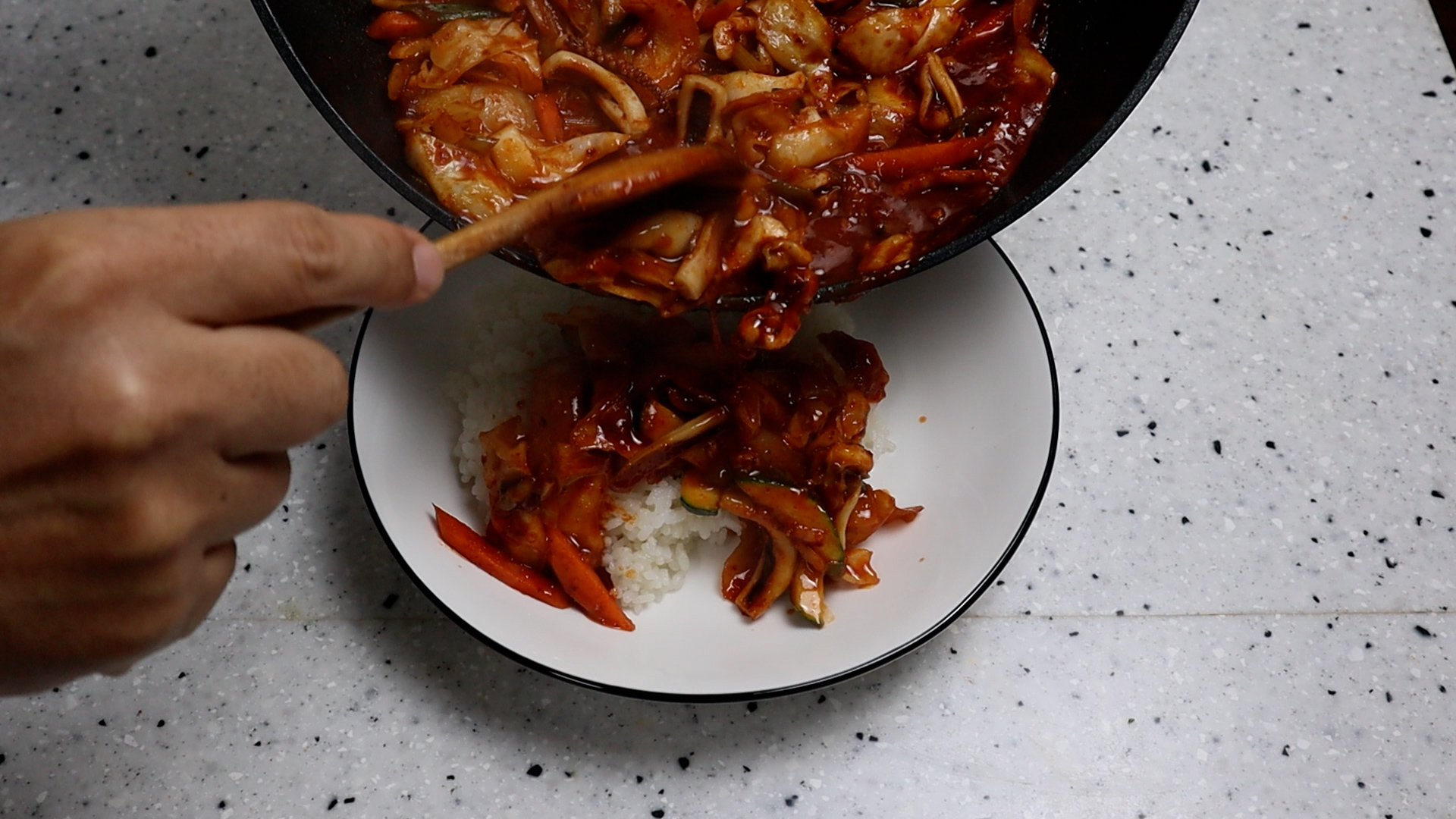 21. 밥 한공기 퍼서 소스 절반을 재료를 골고루 퍼서 얹어보세요!
