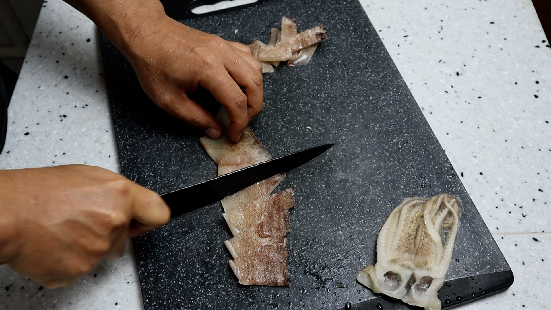 7. 오징어는 작은거 1마리를 기호에 따라 먹기좋게 썰어주세요. 오징어는 완전히 녹여서 써는것 보다 살짝 덜 녹아서 땡땡한 상태로 썰면 서걱서걱 잘 썰린답니다.