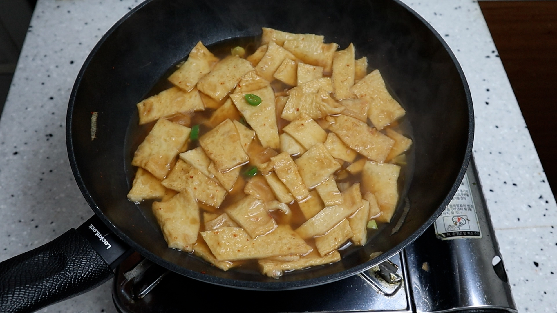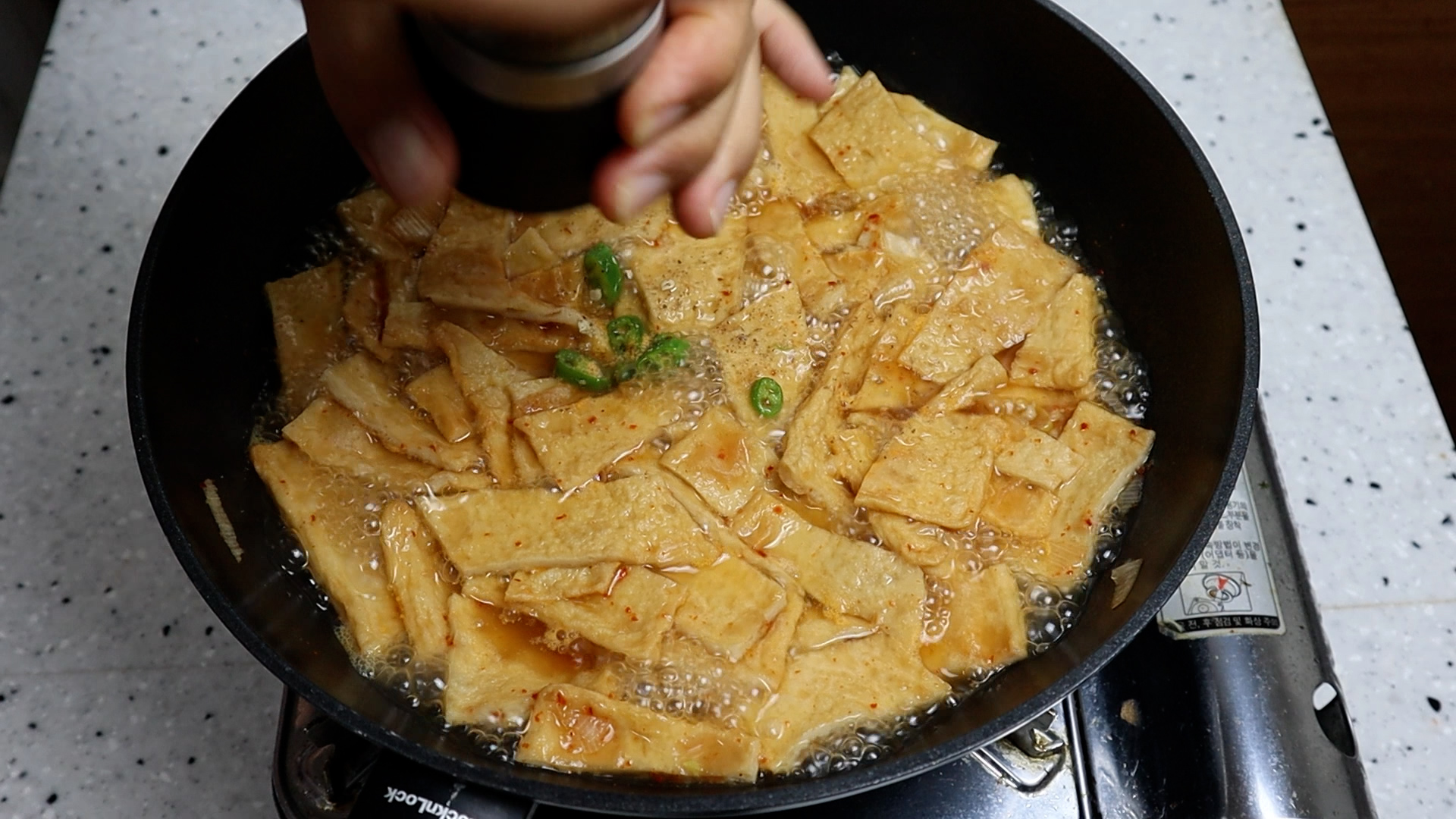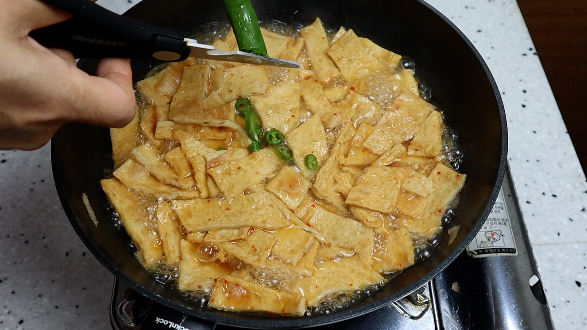 12. 마무리 10~20초 전에 기호에 따라 땡초 반개 정도를 썰어넣으셔도 좋습니다. 다시마를 사용하셨으면 다시마는 건져주시면 됩니다.