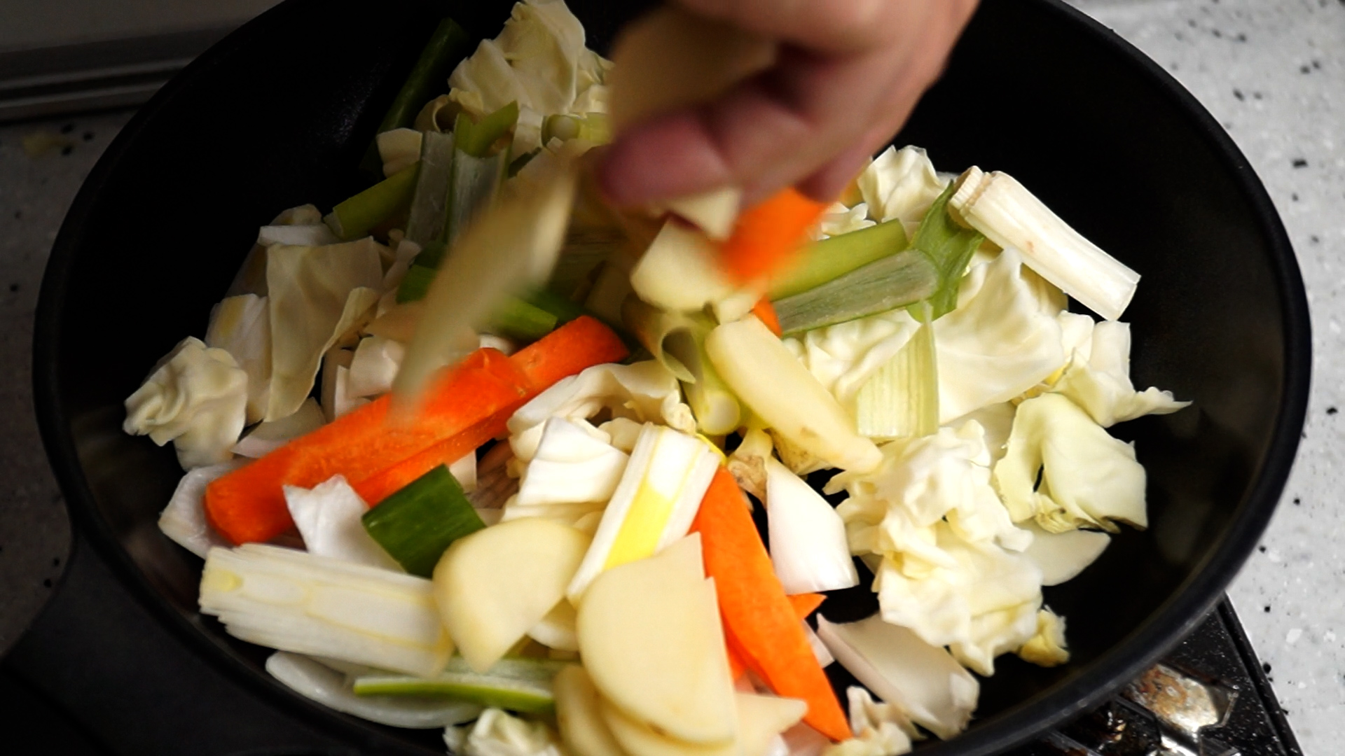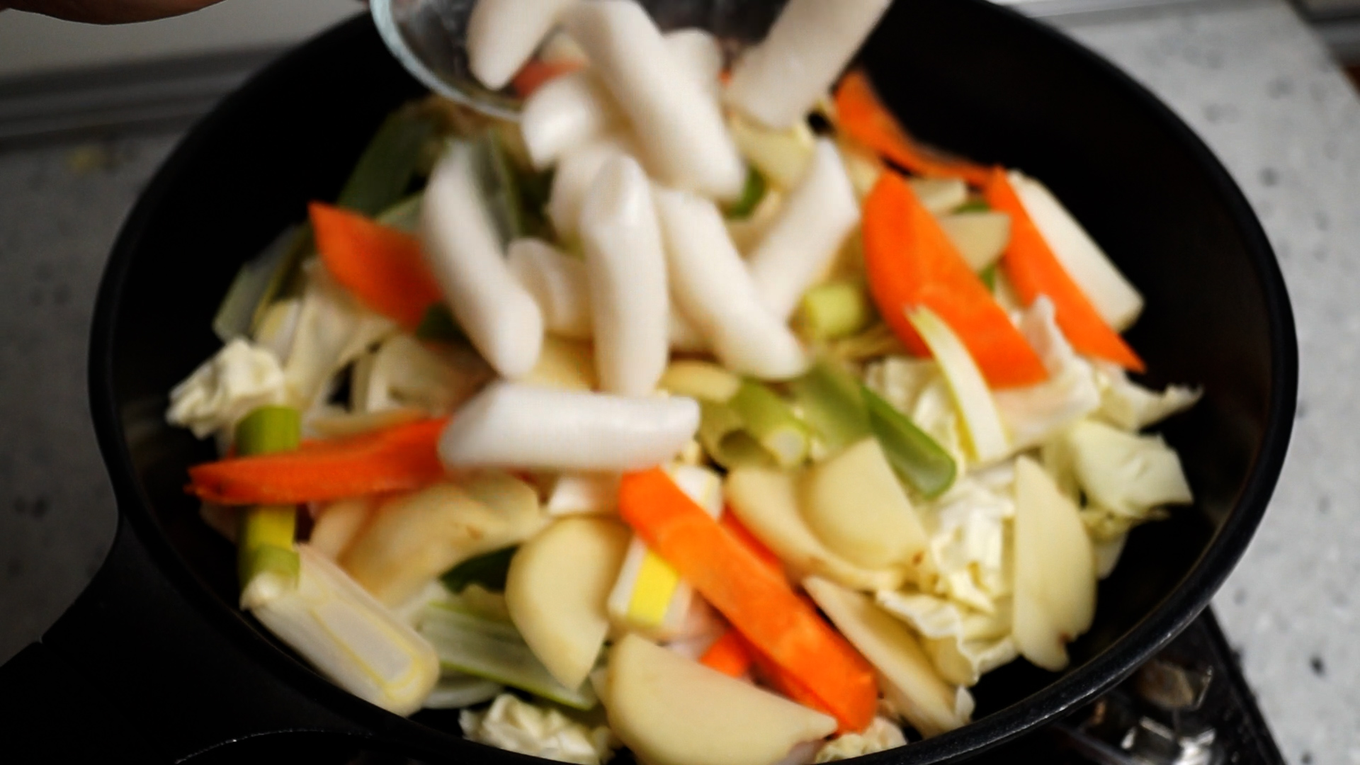 18. 널찍한 팬 바닥에 양파와 양배추를 먼저 깐 다음 나머지 감자와 대파 당근을 올려주세요. 수분이 많은 양파와 양배추가 아래에서 수분을 좀 빼줘야 양념이 덜 탑니다.
