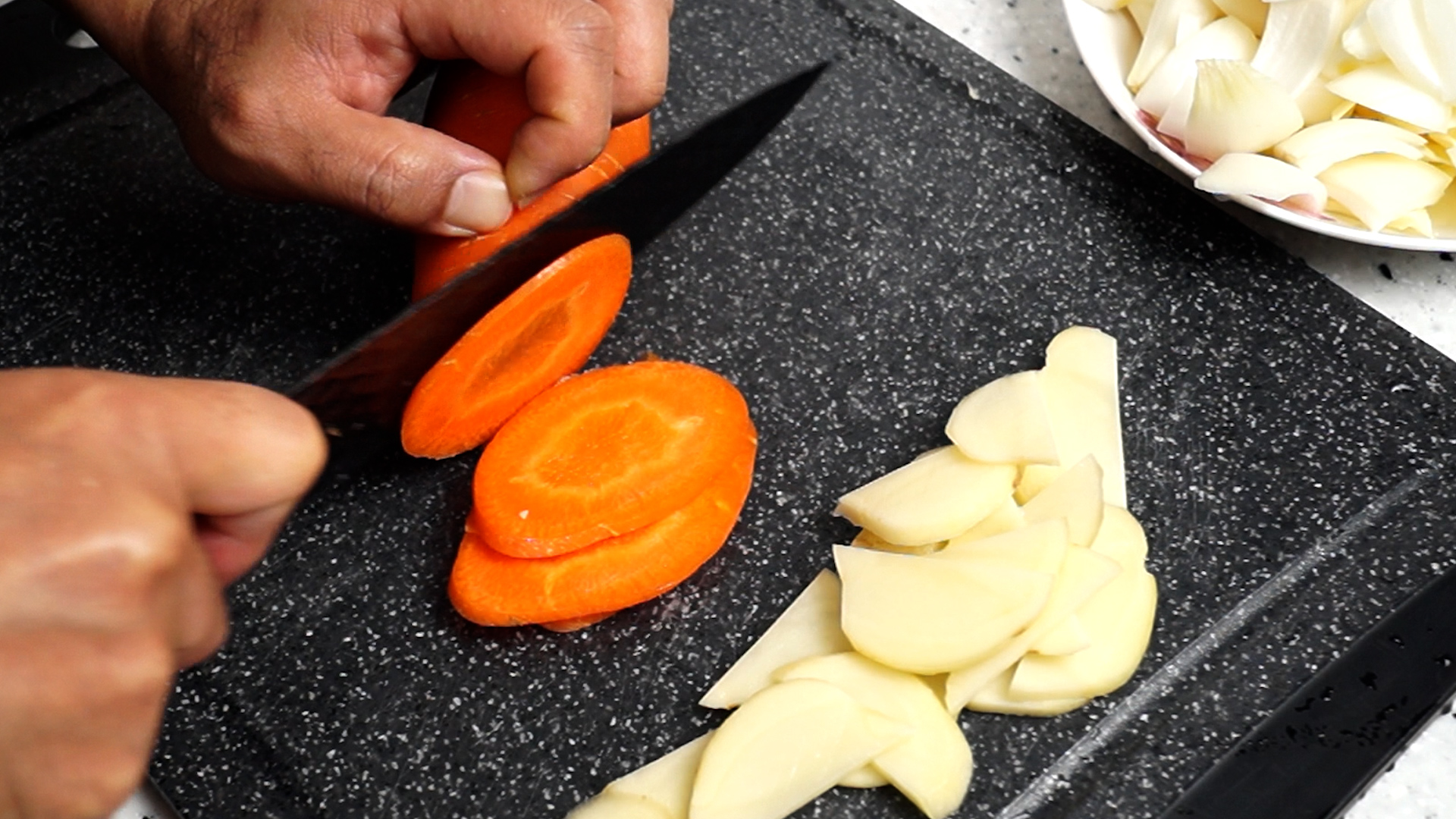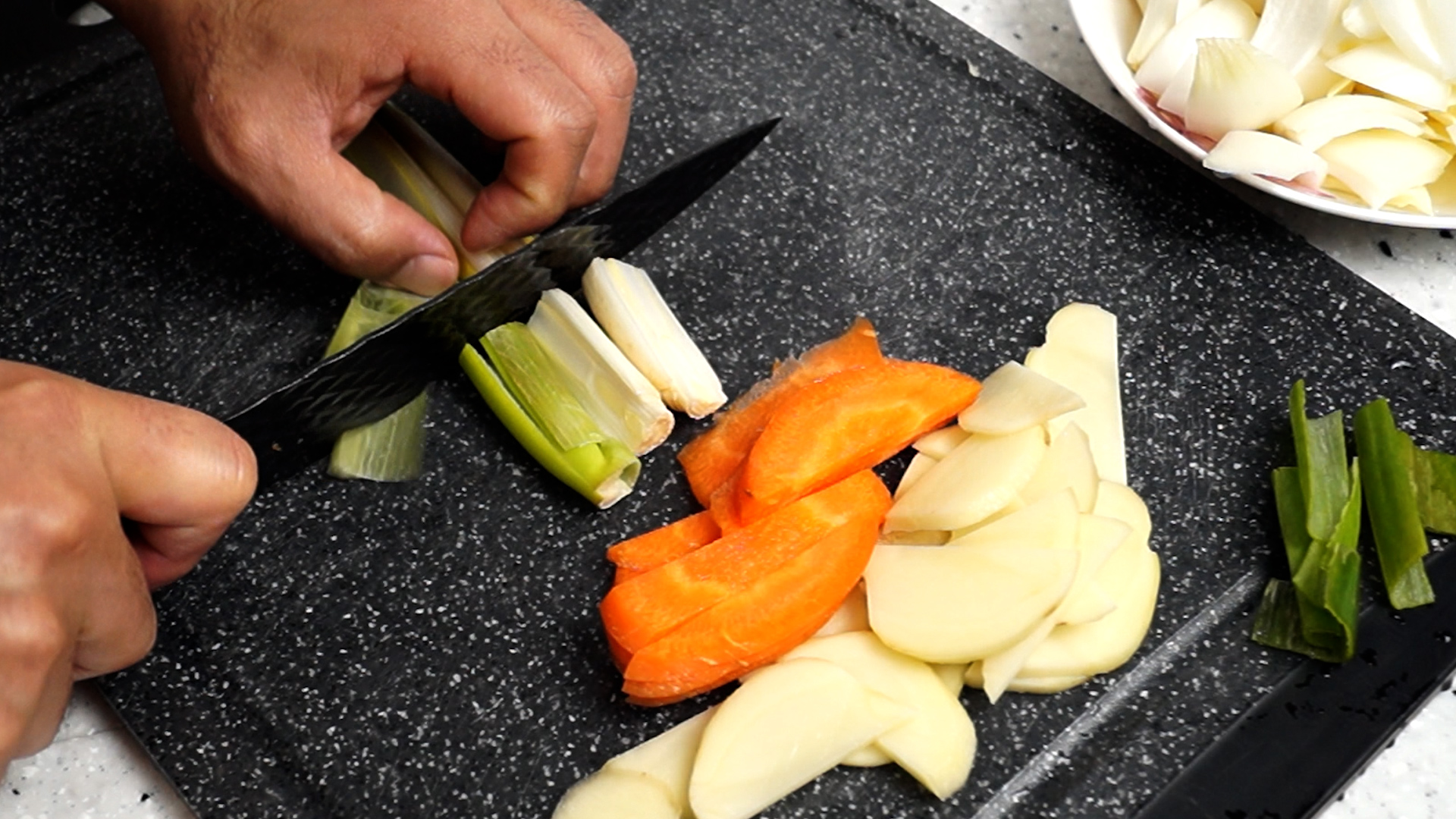 16. 당근도 얇게 썰어서 2~3등분으로 잘라주세요.