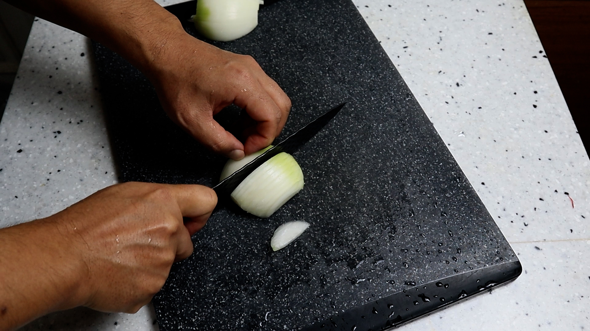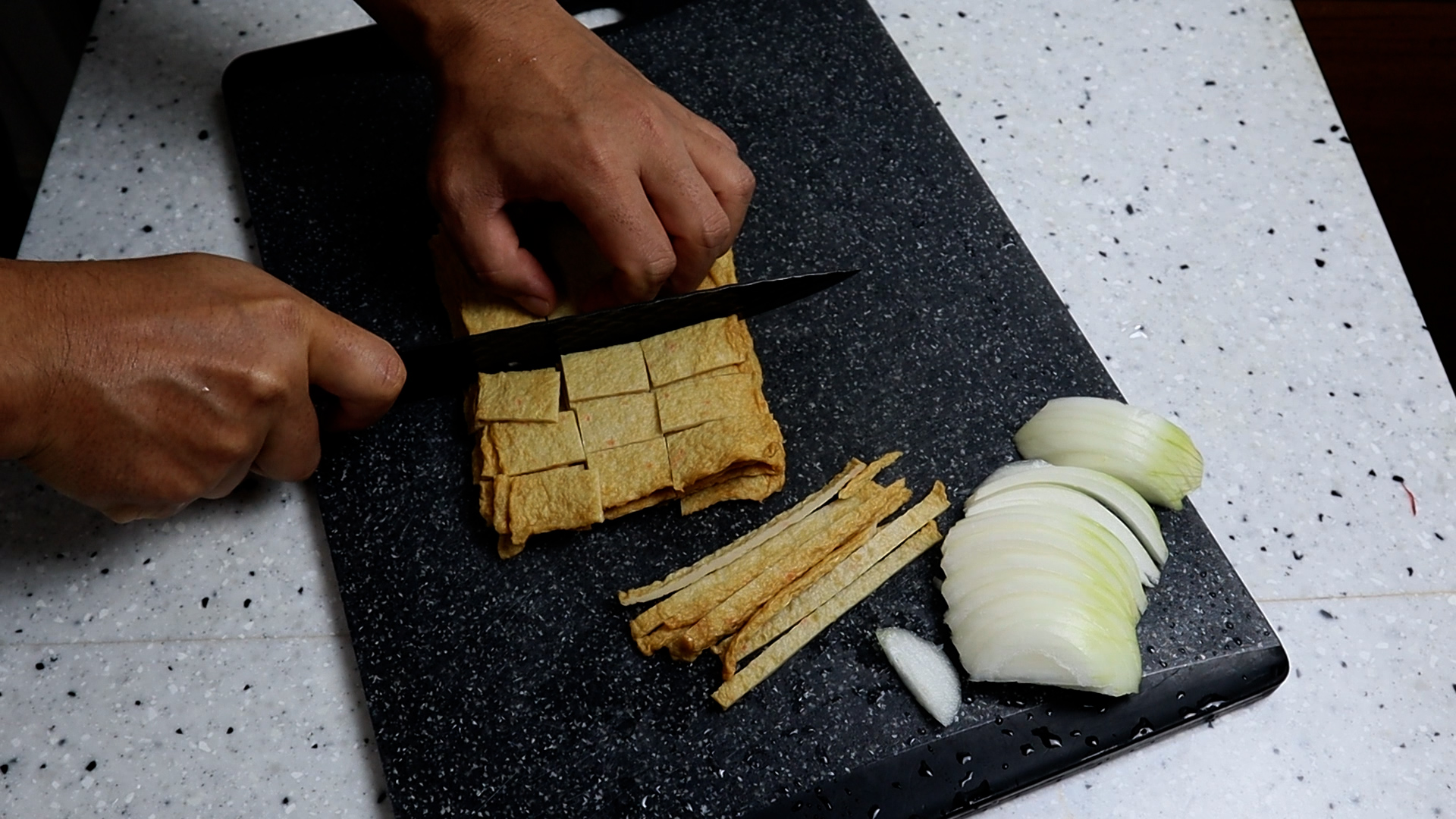 9. 양파반개를 채를 썰어주세요. 양파를 넣고 볶아야 단맛이 더 좋아질 뿐아니라 양파수분이 적당히 섞여 있기 때문에 어묵이 마르지 않고 식어도 촉촉하고 맛있게 먹을수 있습니다.