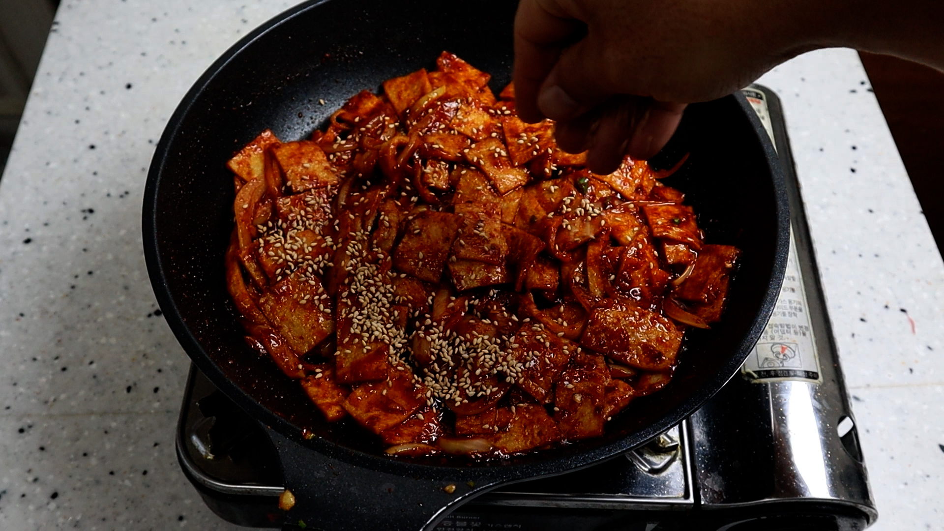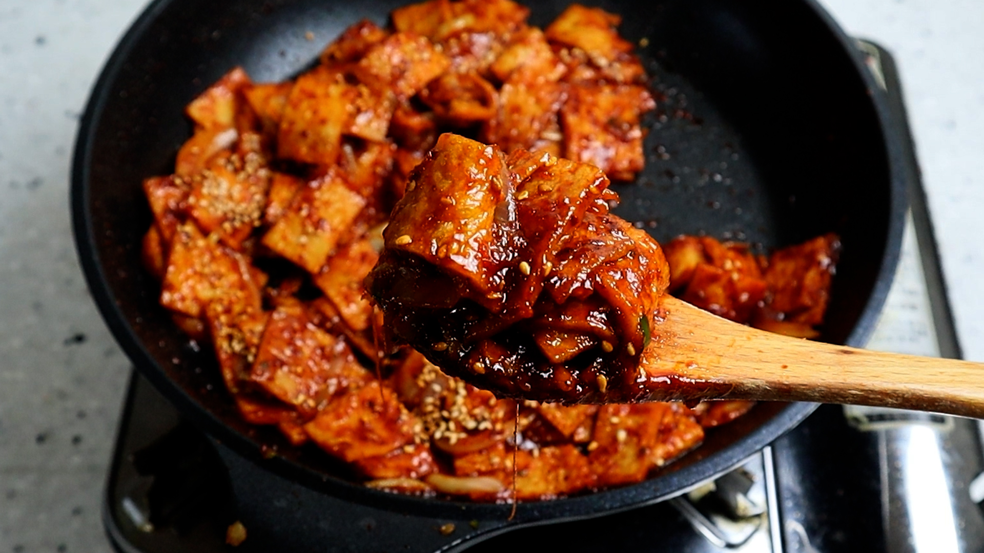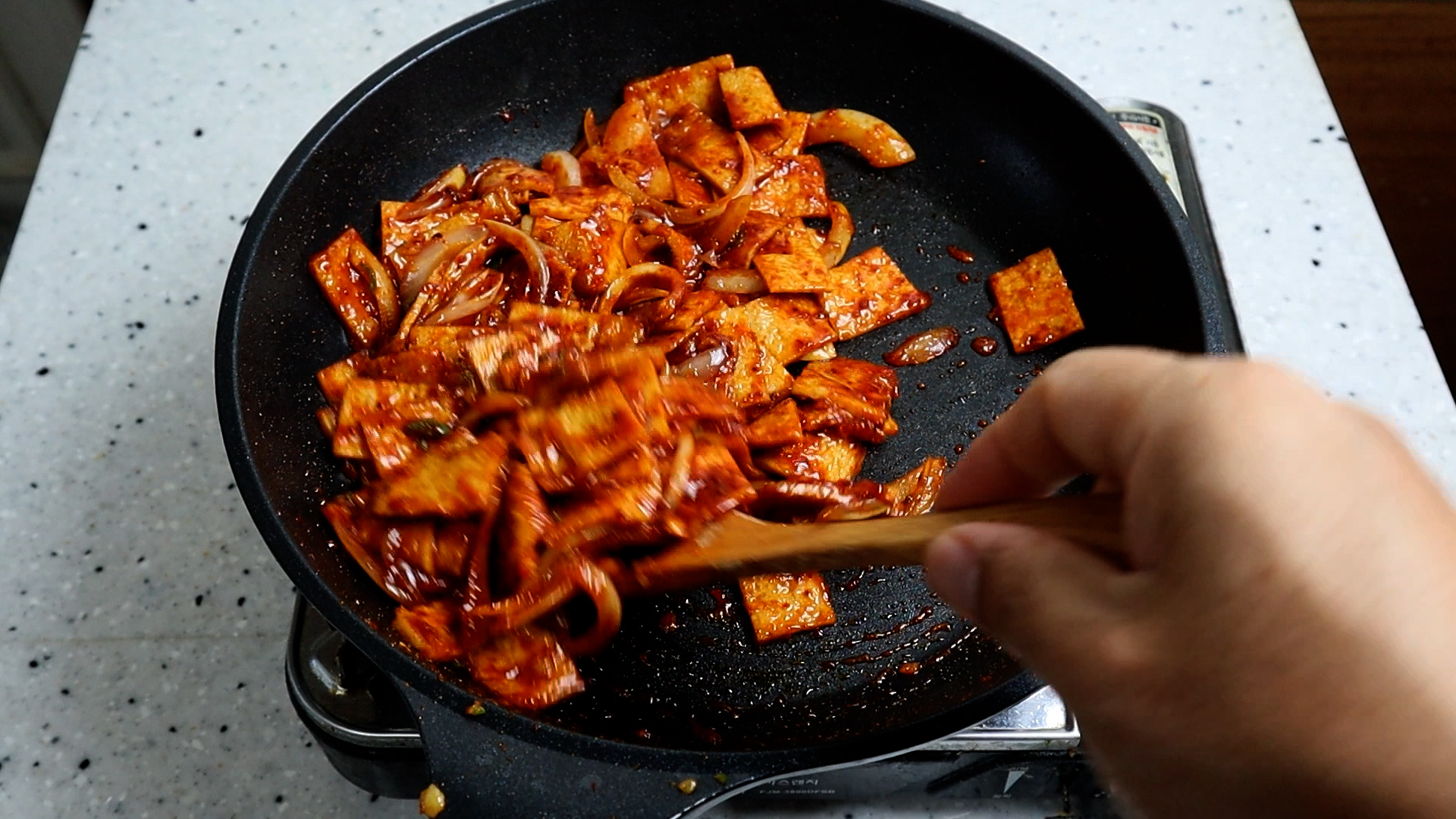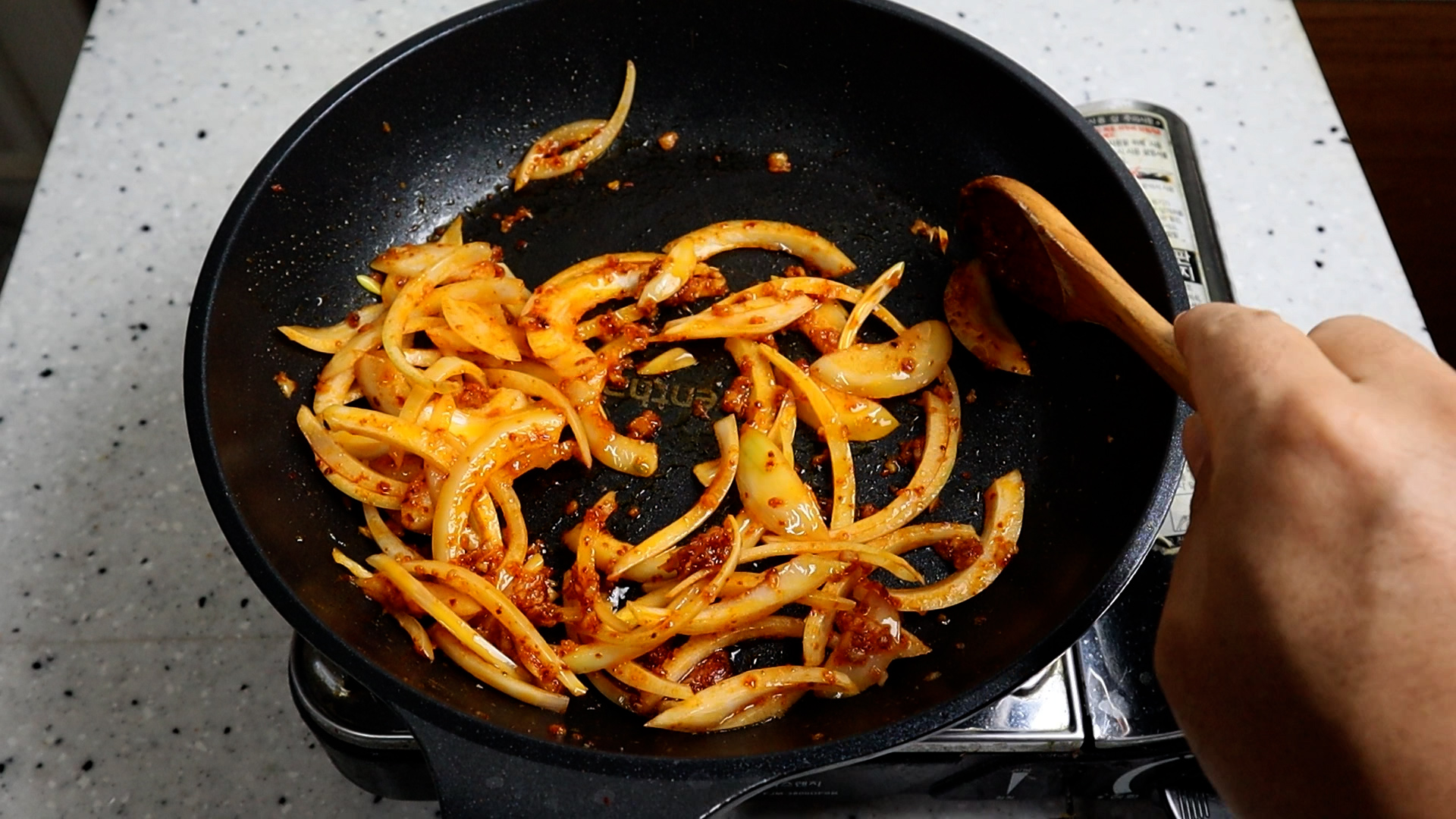 15. 양념장을 넣고는 중불을 유지하고 1분 30초 정도를 휘리릭 볶아주세요. 볶다보면 양념이 톡톡 튈수 있으니 볶는 주걱은 조금 긴걸 사용하시는게 좋습니다.