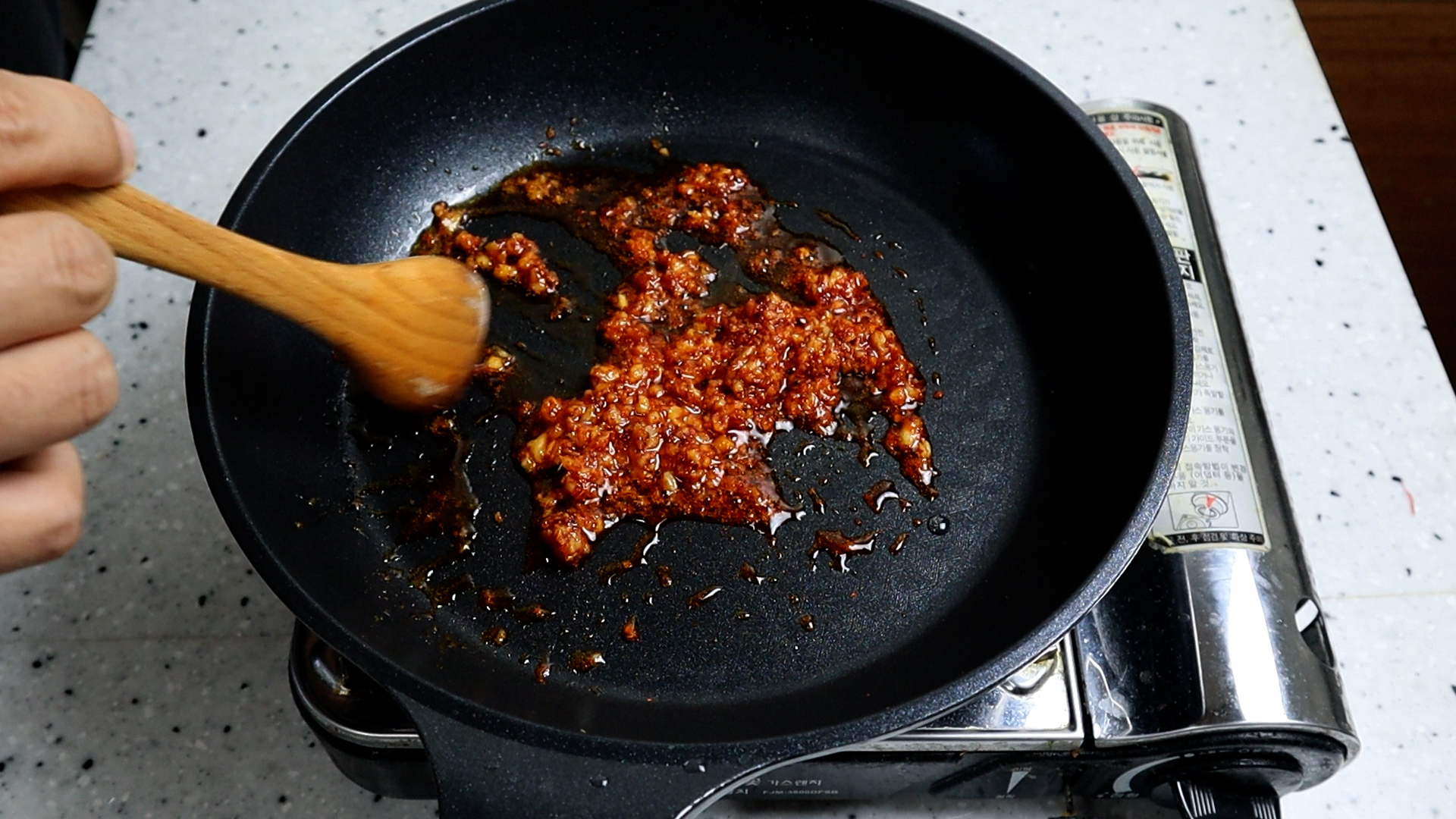 12. 팬에 마늘과 고춧가루 식용유를 넣고 약불에 자글거리면 2분 정도를 볶아주세요. 불이 강하면 고춧가루가 탈수 있으니 약불 주의하세요.