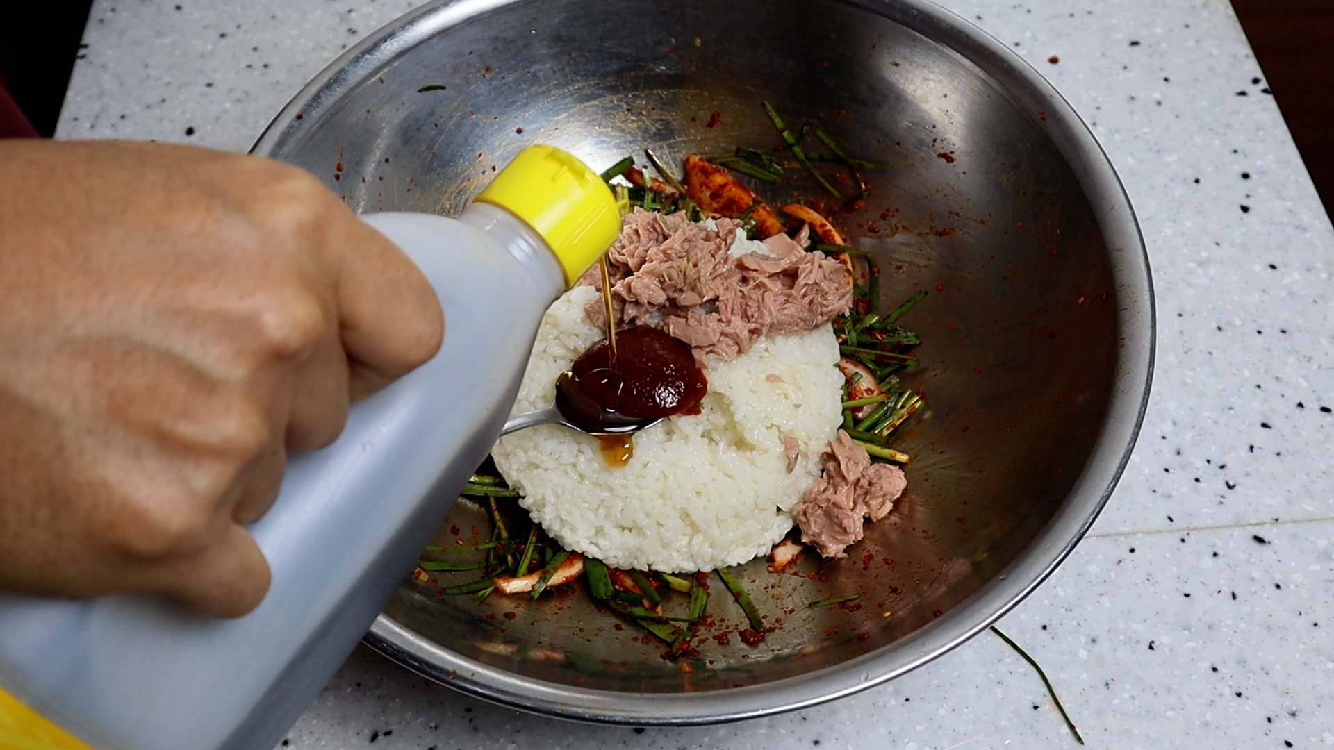 20. 밥비비기 직전에 고소한 참기름 반스푼 더 추가해서 고소함을 살려보세요.