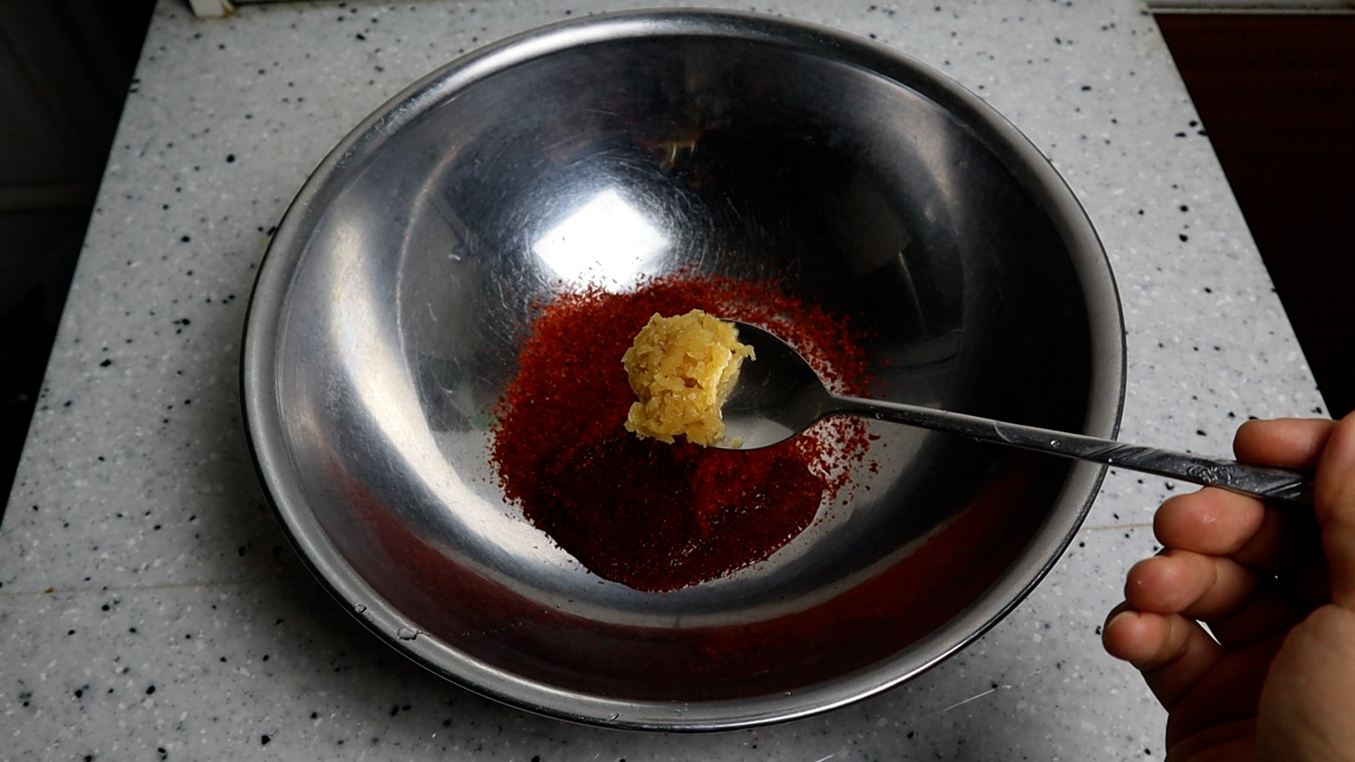 8. 곱게 간 마늘을 넣어주세요. 입자가 굵으면 제대로 된 무침에 양념맛을 낼수가 없습니다.