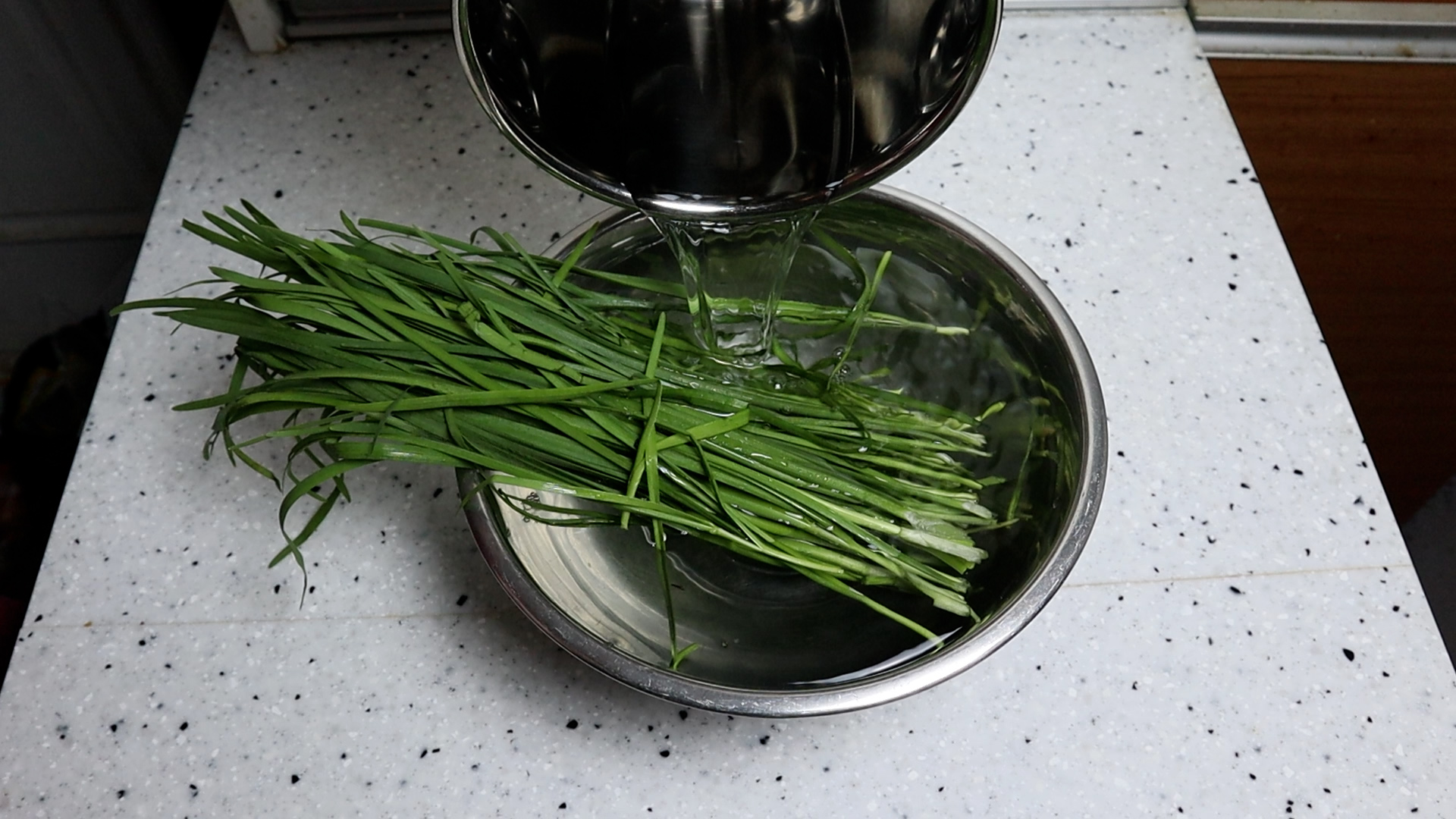 2. 부추에 물을 넉넉하게 부어서 잠기게 한 다음 20분 정도를 불린 다음 살랑살랑 흩어서 부추가 짖무르지 않게 2~3차례 씻어주세요.
