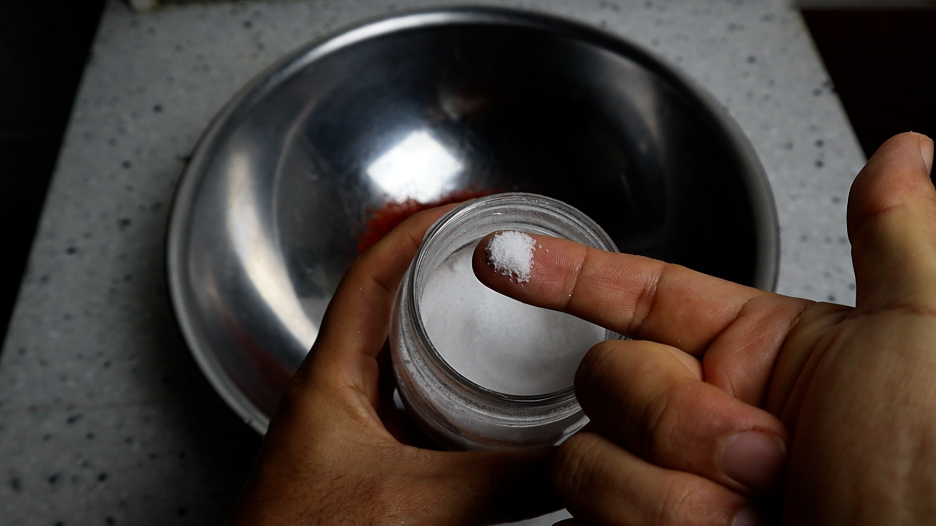 12. 맛소금은 요만큼 집어서 넣어주세요. 좀 두껍게 잡혔으면 2꼬집 얇게 잡혔으면 3꼬집을 넣어주세요.