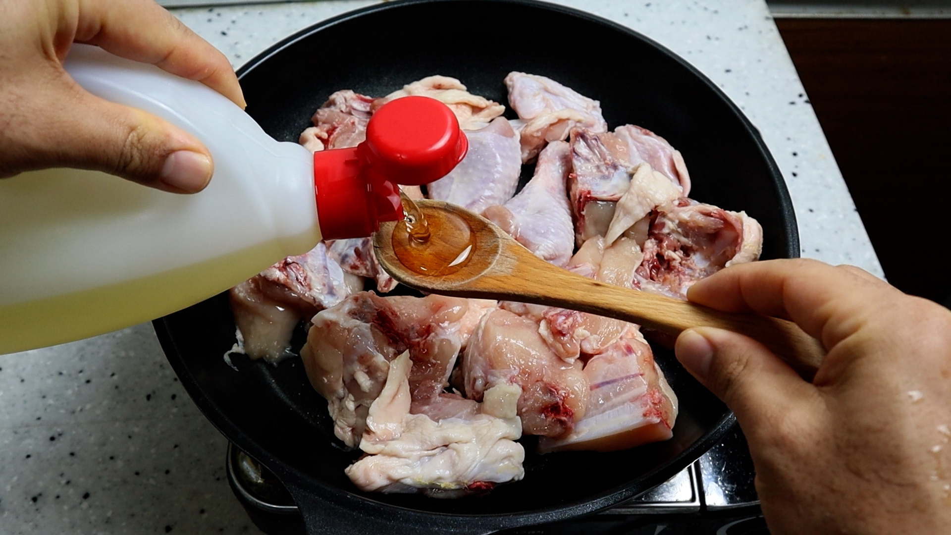 18. 염지한 닭이 담긴 팬을 렌지에 올리고 강불로 올린다음 식용유를 골고루 부어주세요. 닭에 직접 붓는게 아니라 닭 사이사이로 부어서 팬 바닥에 들어가게 부어주세요.