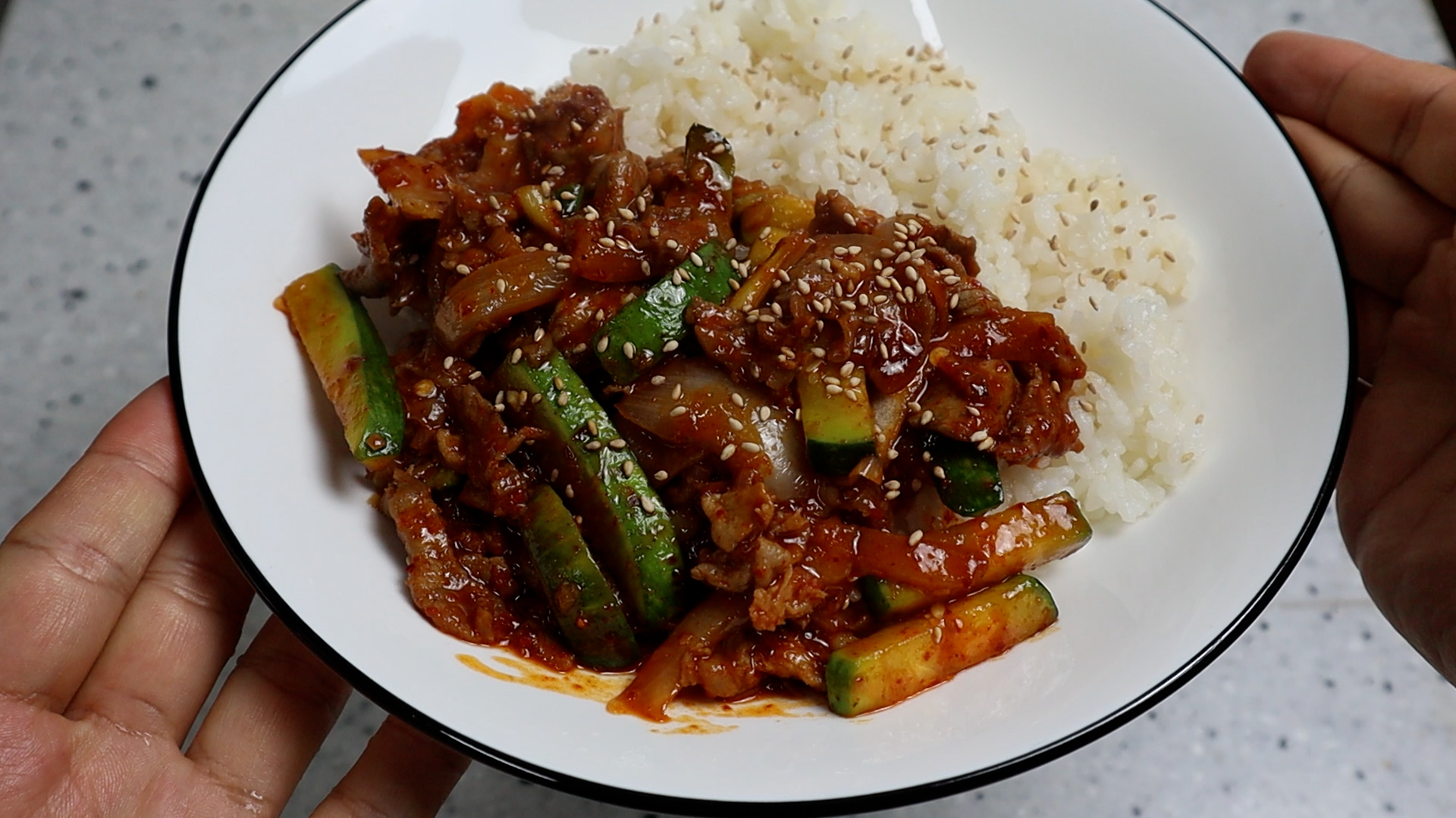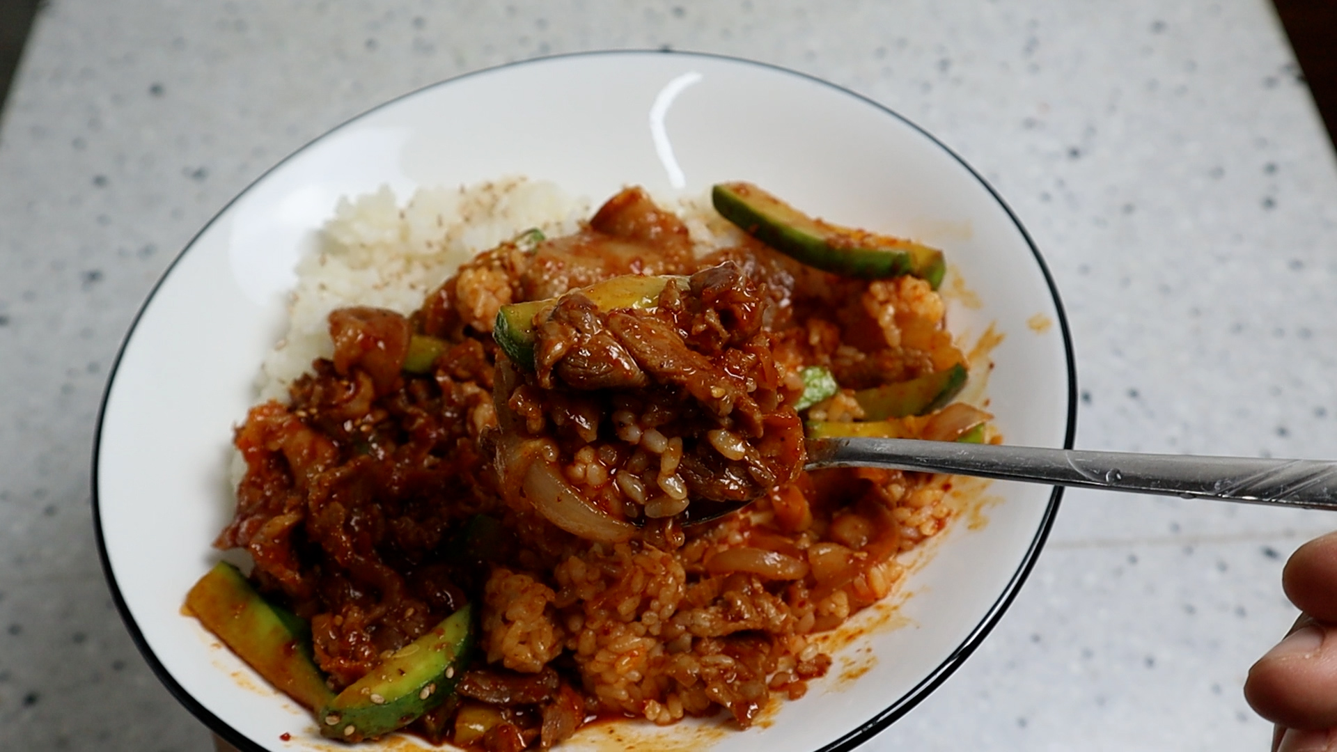 20. 밥위에 애호박볶음을 적당히 올려서 맛있는 덮밥으로 즐겨보세요. 진심 맛있습니다!!