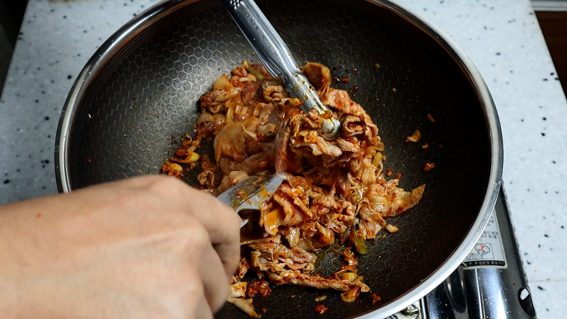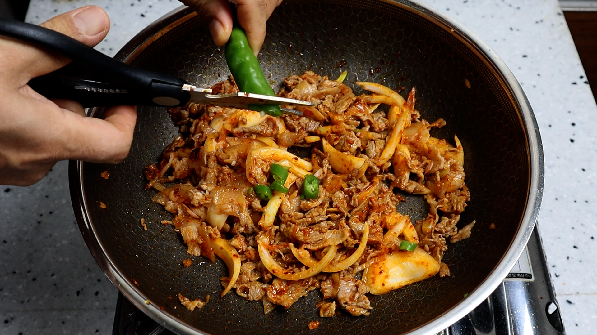 14. 1~2분을 볶아 고기가 80% 이상 익었으면 잘게잘게 잘라주세요. 한입 크기로 먹기좋게 써는게 아니라 밥에 비벼서 밥이랑 퍼먹을때 좋은 크기로 좀 잘게 잘라주셔야 합니다.