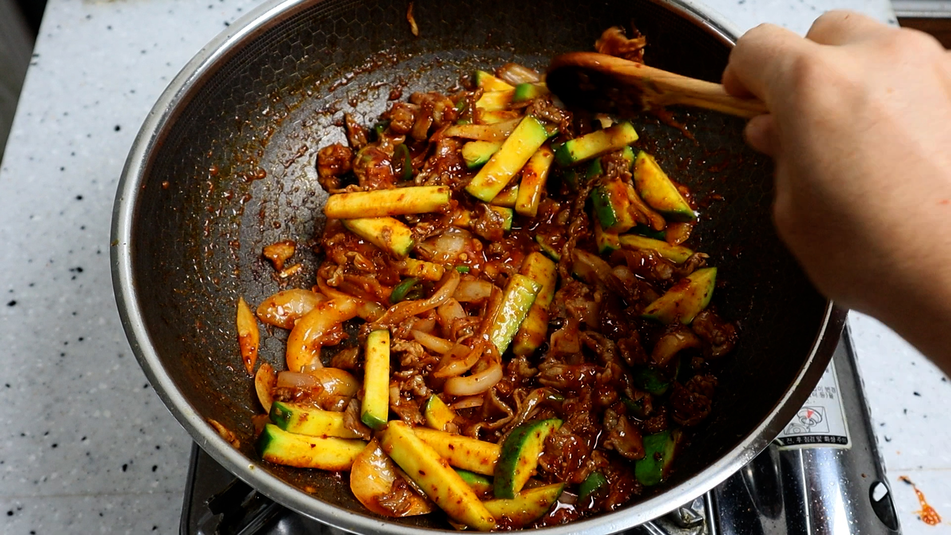 17. 애호박을 넣은 다음 강불 유지하고 또 1분 30초를 볶아주세요.