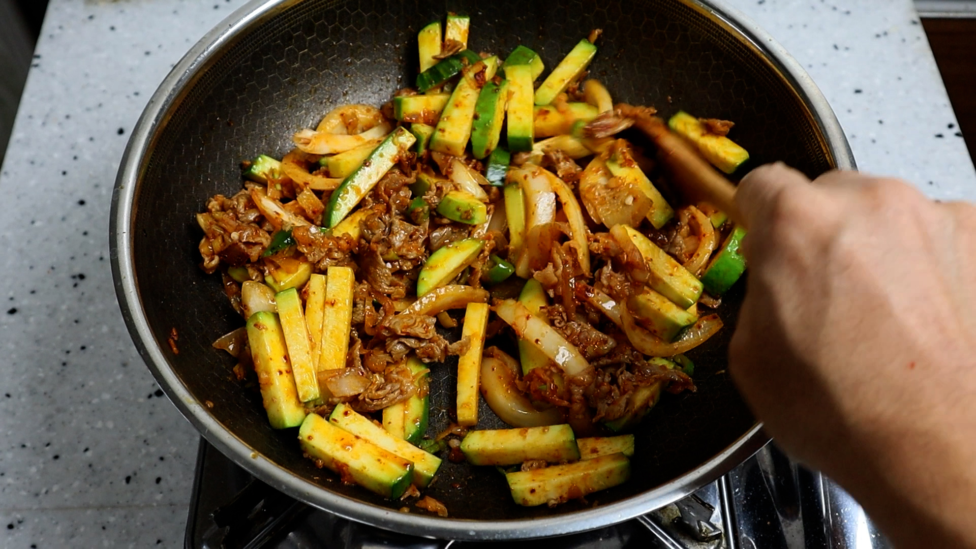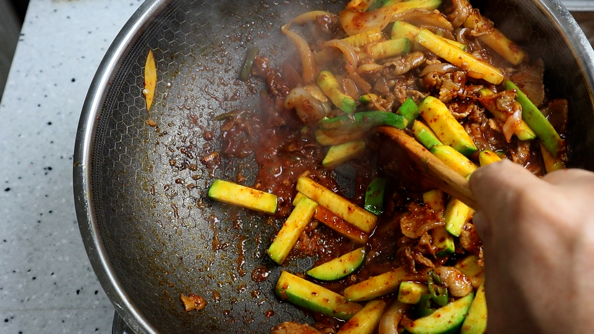 19. 사진처럼 수분감은 거의 없이 양념이 식용유와 고기기름에 볶아져야 제대로 맛있는 애호박볶음이 되니까 수분 나올틈 없게 강불로 볶아주세요.
