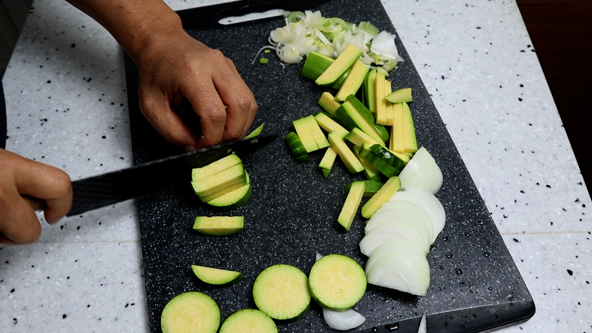 3. 애호박을 1cm 두께로 썰어서 길이방향도 1cm 두께로 잘라주세요. 애호박 한개가 대략 300g 정도가 나가니 긴호박 쓰실분들은 참고하세요.